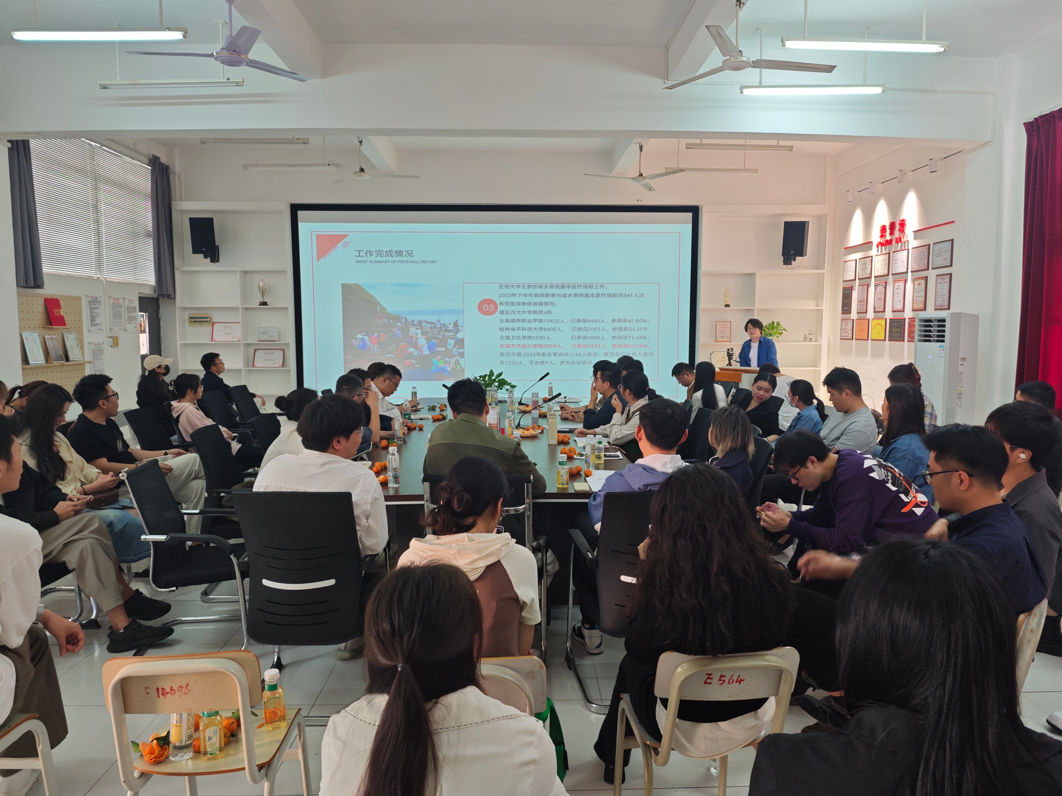 李刘园着重讲述了新生体检、学生证办理和班会材料收集等工作的执行情况。通过她的汇报,可以看出学院对新生的入学管理和服务工作的高效有序。