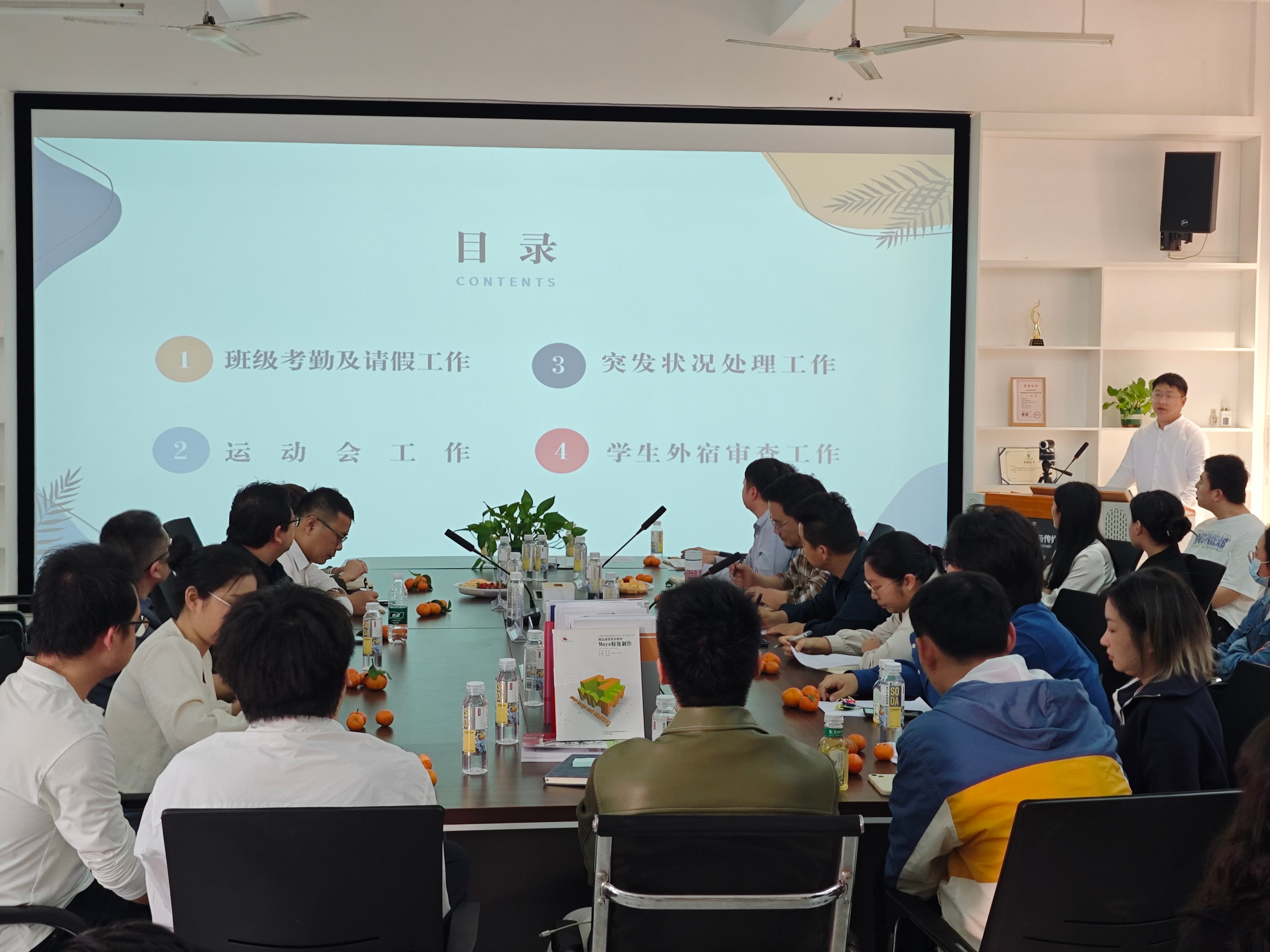 杨若飞副主任首先就班级考勤、请假流程、突发状况处理、运动会组织以及学生外宿审查等方面的工作进行了详细汇报。他的发言突出了对学生日常管理的精细化和规范化,体现了学院对学生生活全方位的关怀和支持。