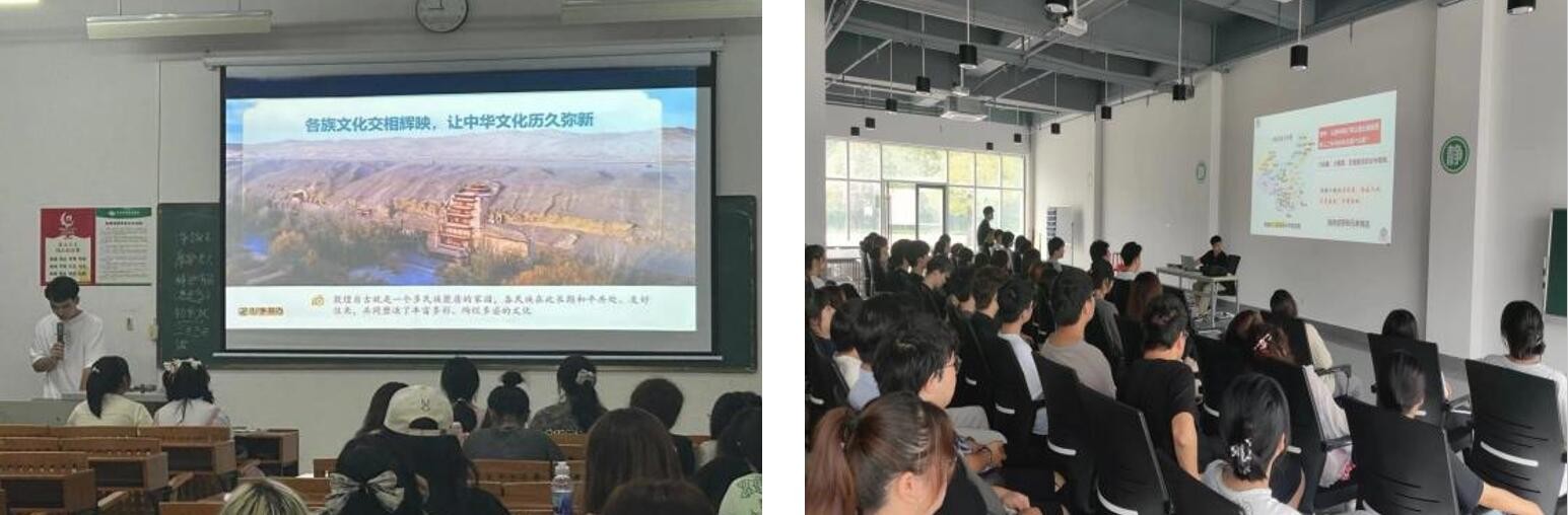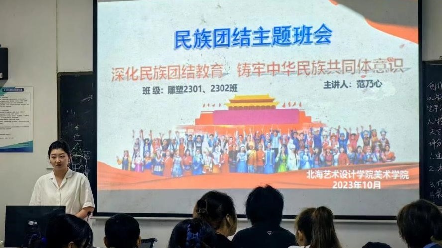 其中雕塑230102班,辅导员范乃心以集中宣讲的形式开展,该班活动分为以下几个部分:1.提问导入 2.教师宣讲民族团结内容 3.辅导员领学《高校宗教工作有关法律法规》4.总结。在教师宣讲中,学生加深对民族团结政策、宗教法律法规和中华民族共同体意识的认识。