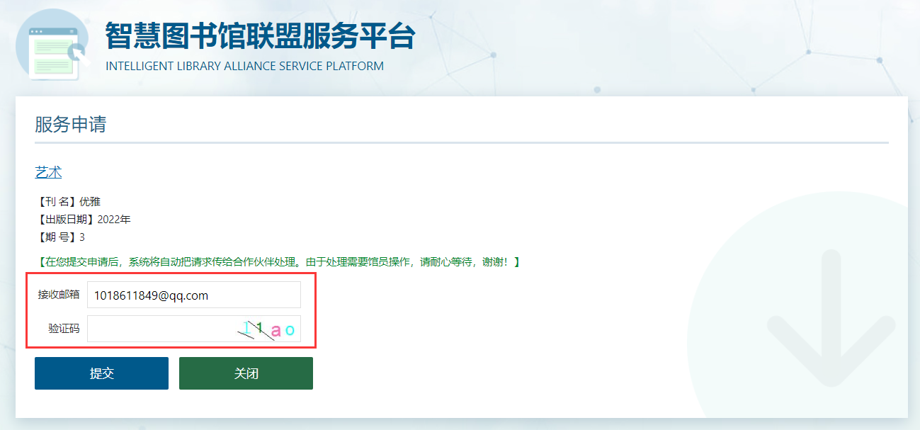 标有“文献传递”标识的文献,点击后进入传递界面,只需在申请界面输入邮箱以及验证码,点击提交后等待片刻即可收到所需文献,可以进入邮箱下载,也可进入右上方我的文献申请里查看。