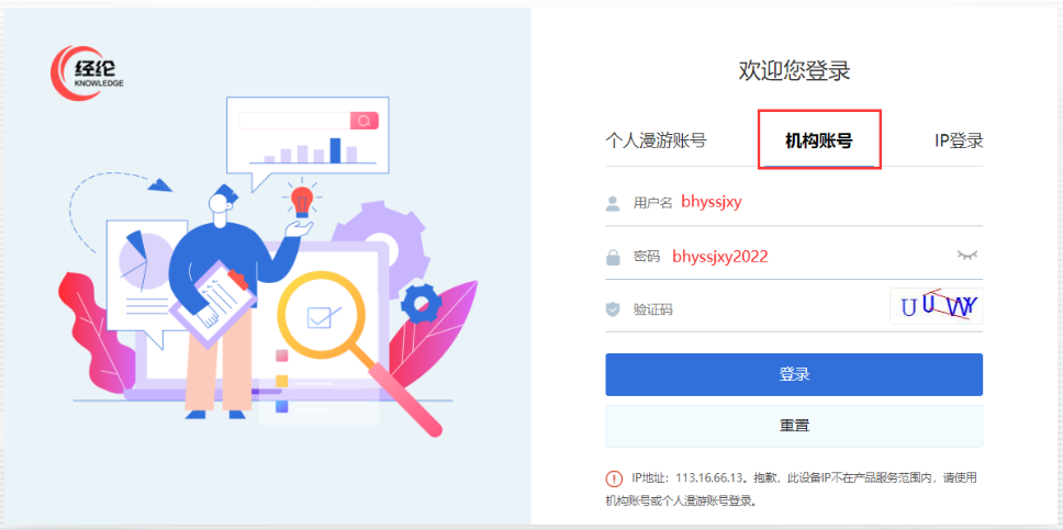 1. 因校园网外打开经纶平台网址:http://k.vipslib.com/ ,无法自动识别登录,如您已注册过个人账号,请使用个人漫游账号登录,如为注册过请选择机构账号登录,并输入学校机构账号:bhyssjxy,密码:bhyssjxy2022,即可登录,登入过后右上角会显示学校名称。