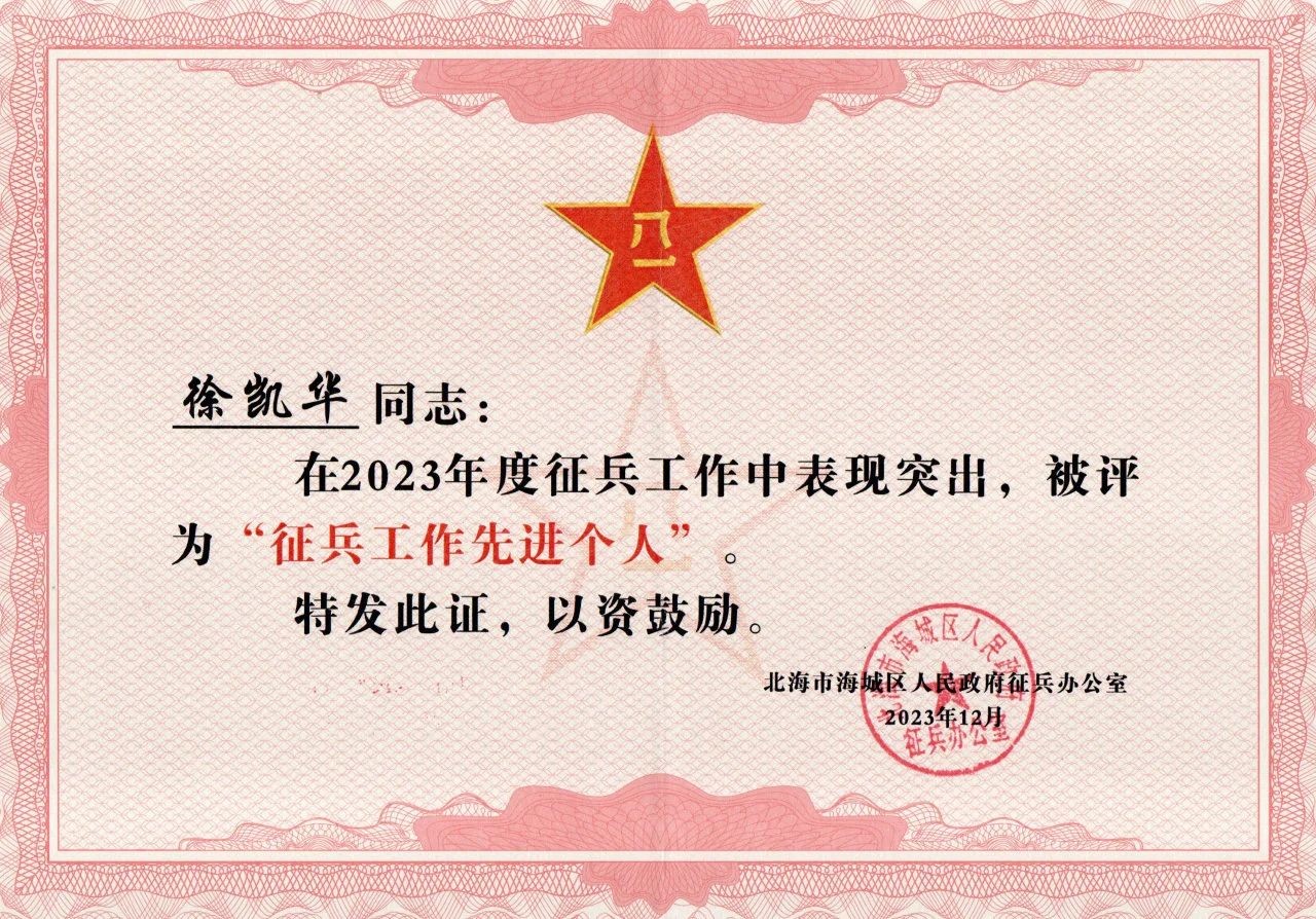 3月14日,北海市海城区人民政府征兵办公室表彰了2023年度海城区征兵工作的先进单位和先进个人,我校教师徐凯华荣获“征兵工作先进个人”称号。这一荣誉的获得,不仅是对徐凯华老师辛勤工作的肯定,更是对我校学生工作处征兵工作的认可。