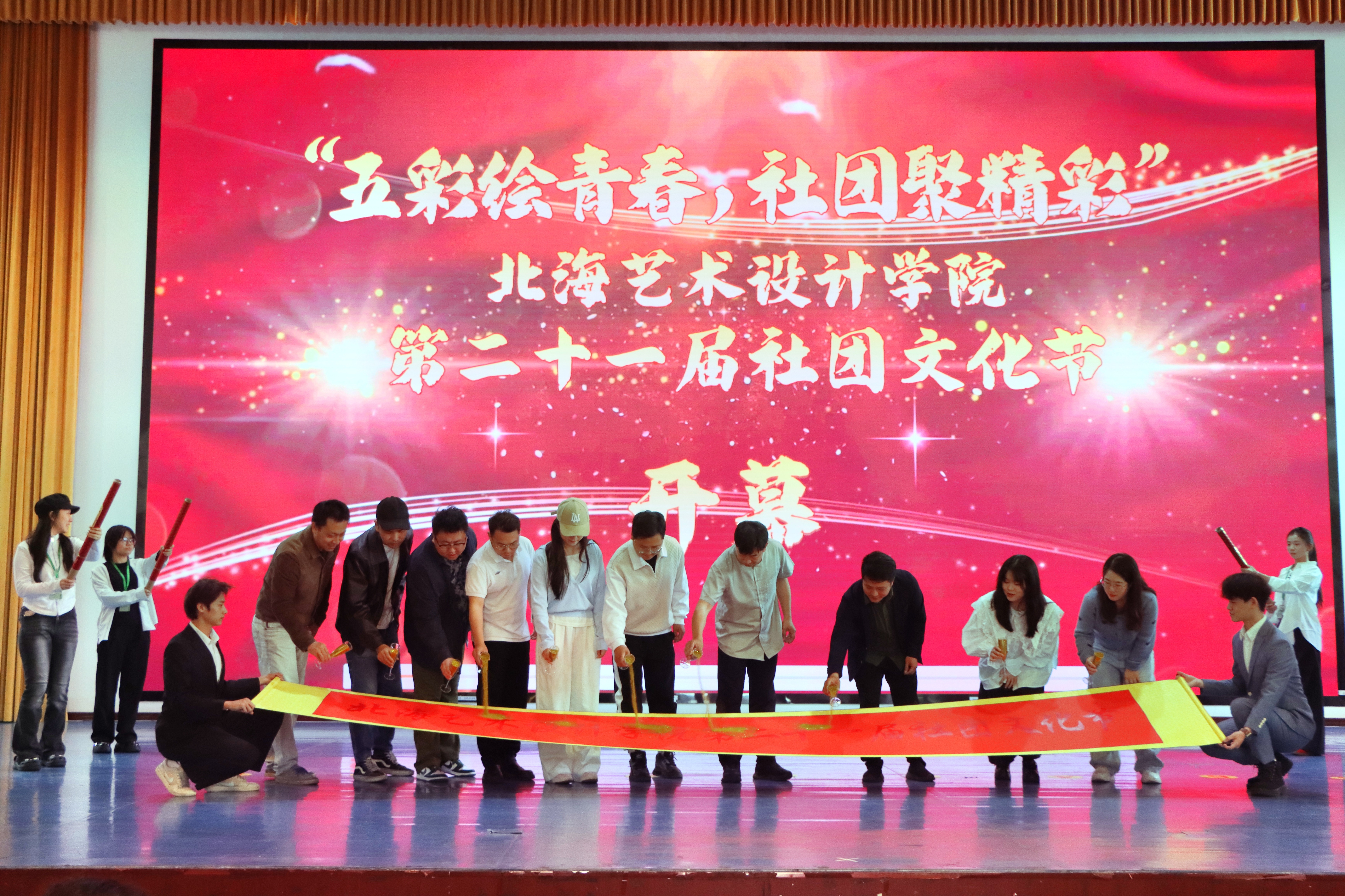 3月21日,北海艺术设计学院第二十一届社团文化节开幕式在大礼堂顺利举行 。本次文化节以“五彩绘青春、社团聚精彩”为主题,旨在展现丰富多彩的校园社团文化,为北艺学子们搭建青春风采的展示舞台。党委副书记彭仁、团委书记唐良春携校团委及分团委教师代表出席活动,与同学们共同见证这场文化盛宴。
