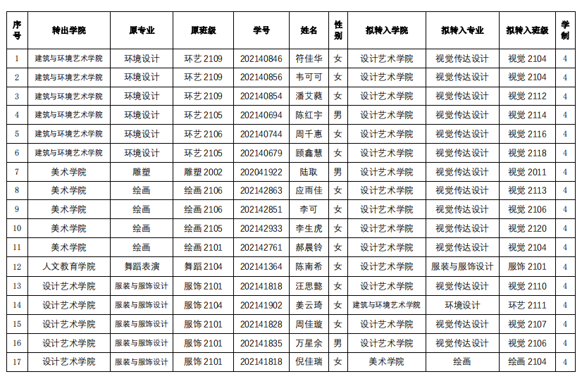 符佳华等17名申请转专业同学的名单