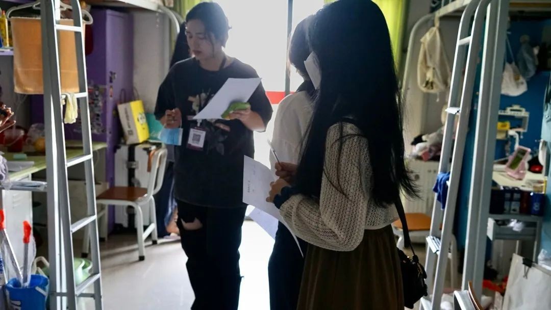 在宿管阿姨的带领下各部门学生干部进入宿舍进行随机抽查评比,检查过程中干部们都在认真的执行检查工作。