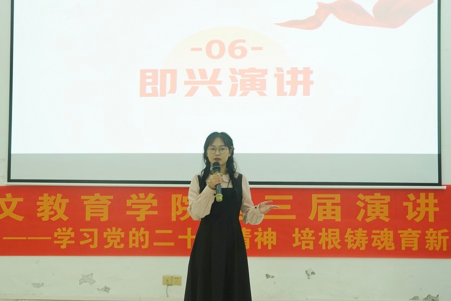 比赛第一环节为主题演讲,参赛选手们围绕演讲主题、结合自身成长经历展现了对教师这一职业的敬佩与向往之情,也分享了自己对教育的见解。选手们在演讲中表示,要从自身做起,牢记习近平总书记在党的二十大讲话中提到的“砥砺奋进三十载 培根铸魂育新人”,并呼吁广大青年学子自觉担当,以习近平新时代中国特色社会主义思想培育时代新人的伟大使命,矢志不渝听党话、跟党走。