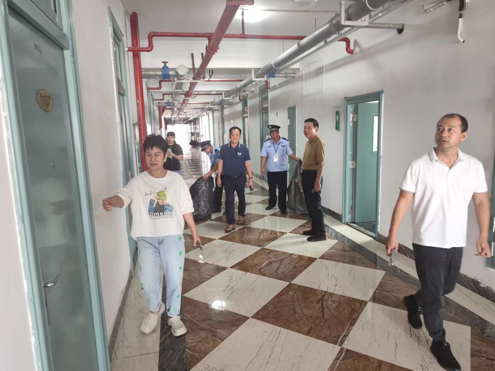 为贯彻落实自治区安委会《第一届全国学生(青年)运动会期间安全风险隐患专项排查整治工作方案》(桂教安稳〔2023〕26号)要求,10月26日学校刘朝雄副校长带队组织开展了全校安全风险隐患专项排查整治,此次排查重点排查了高层学生宿舍、食堂、超市、快递点、图书馆、实验室、电动车停放充电场所,并要求相关部门对排查出的安全隐患问题进行即刻整改。校长助理刘宗华,学校保卫处、后勤处、学工处等部门工作人员参与的排查行动。(冯海波/摄)