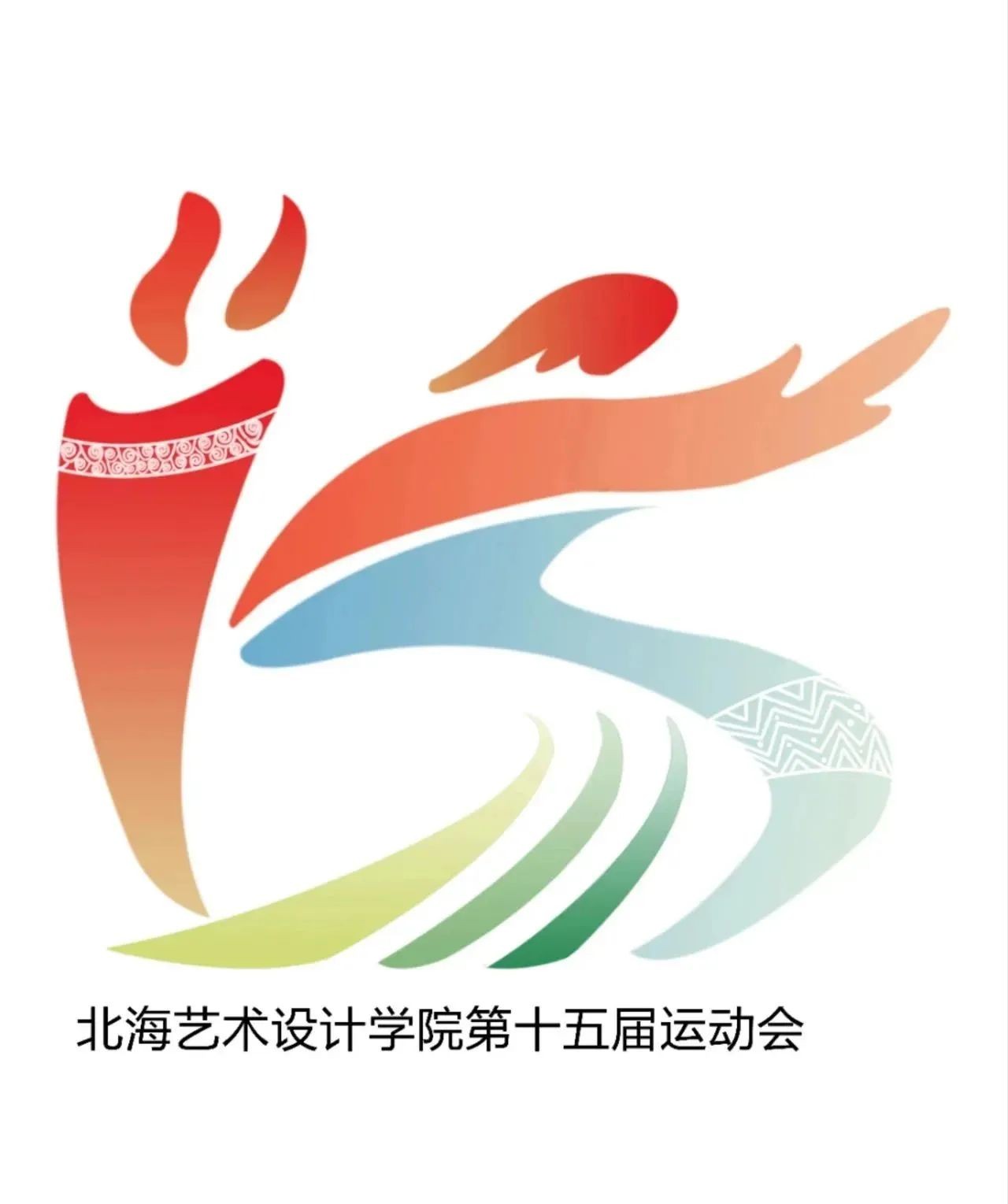 视觉2233班王慧、覃轶科、周倩美:会徽采用图文结合的方式展示出北海艺术设计学院第十五届运动会的精神风貌。会徽以四个部分组合设计而成,整体宛如一个正在奔跑、运动中的人形。会徽顺时针旋转45度观看,又似数字“15”。在会徽中,每一个部分均由毛笔刷绘制融合而成,毛笔可彰显学校围绕“艺术”而行的教学特色;其次,毛笔刷的画笔效果能更为有力的展现出“运动”、“速度”的特点;毛笔刷中代表人形的“腿部”、“腰部”、“手部”的位置采用了直线裁切成方式表现,能更好的展现出“运动中的人形”的力量感。最后,色彩采用渐变设计,令会徽图案更显“青春”、“向上”的精神风貌,同时更具视觉层次感,能更好的彰显体育竞技运动精神。