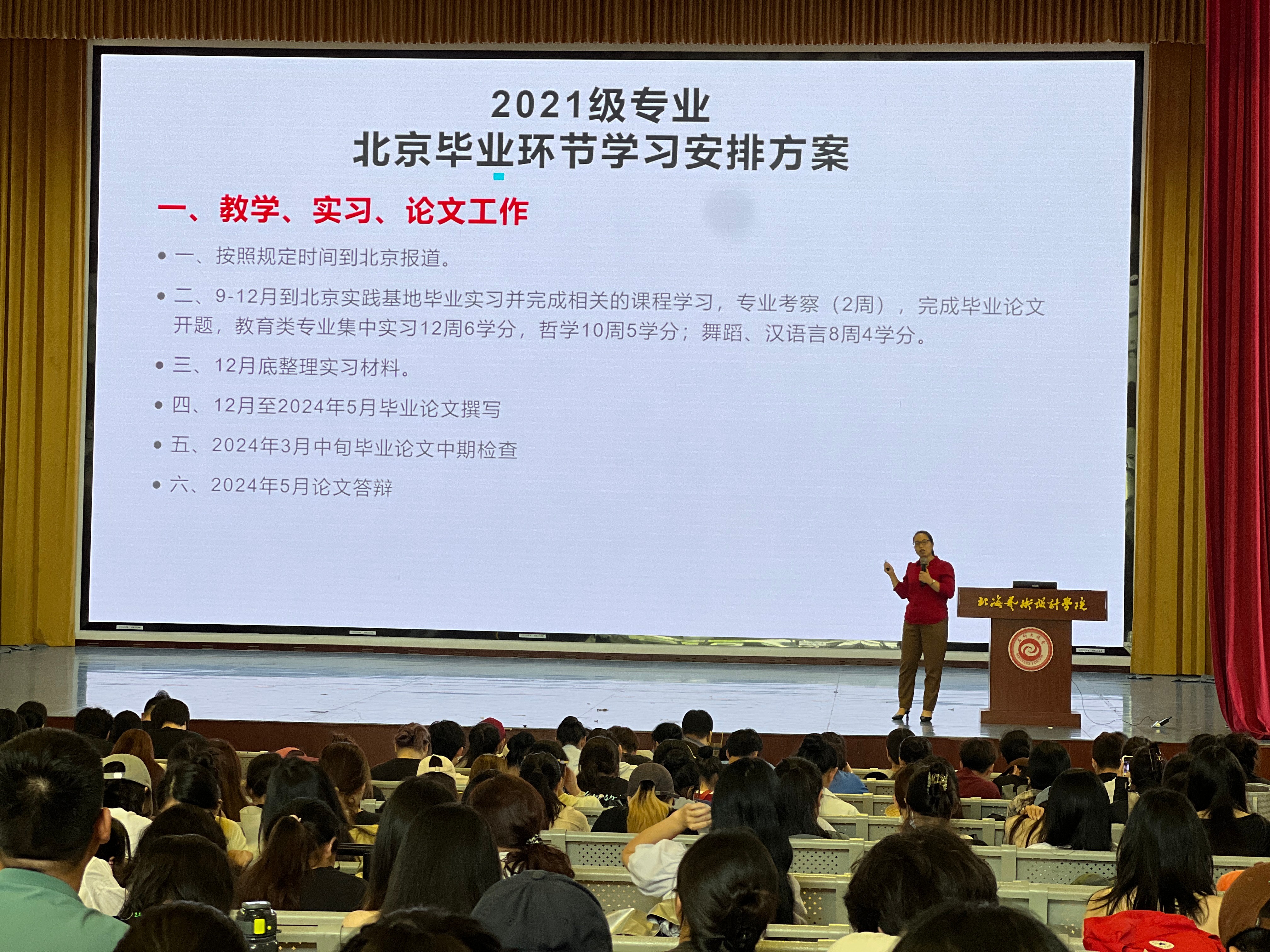 熊秀峰院长以“三年前为什么选择北艺?”“去北京做什么?”为导入,向学生讲解了大四在京学习的具体安排和要求,并与同学们就北京学习方法和生活方式进行了深入的沟通交流,帮助同学们更充分更科学应用北京优质资源全面提升自己的综合能力。