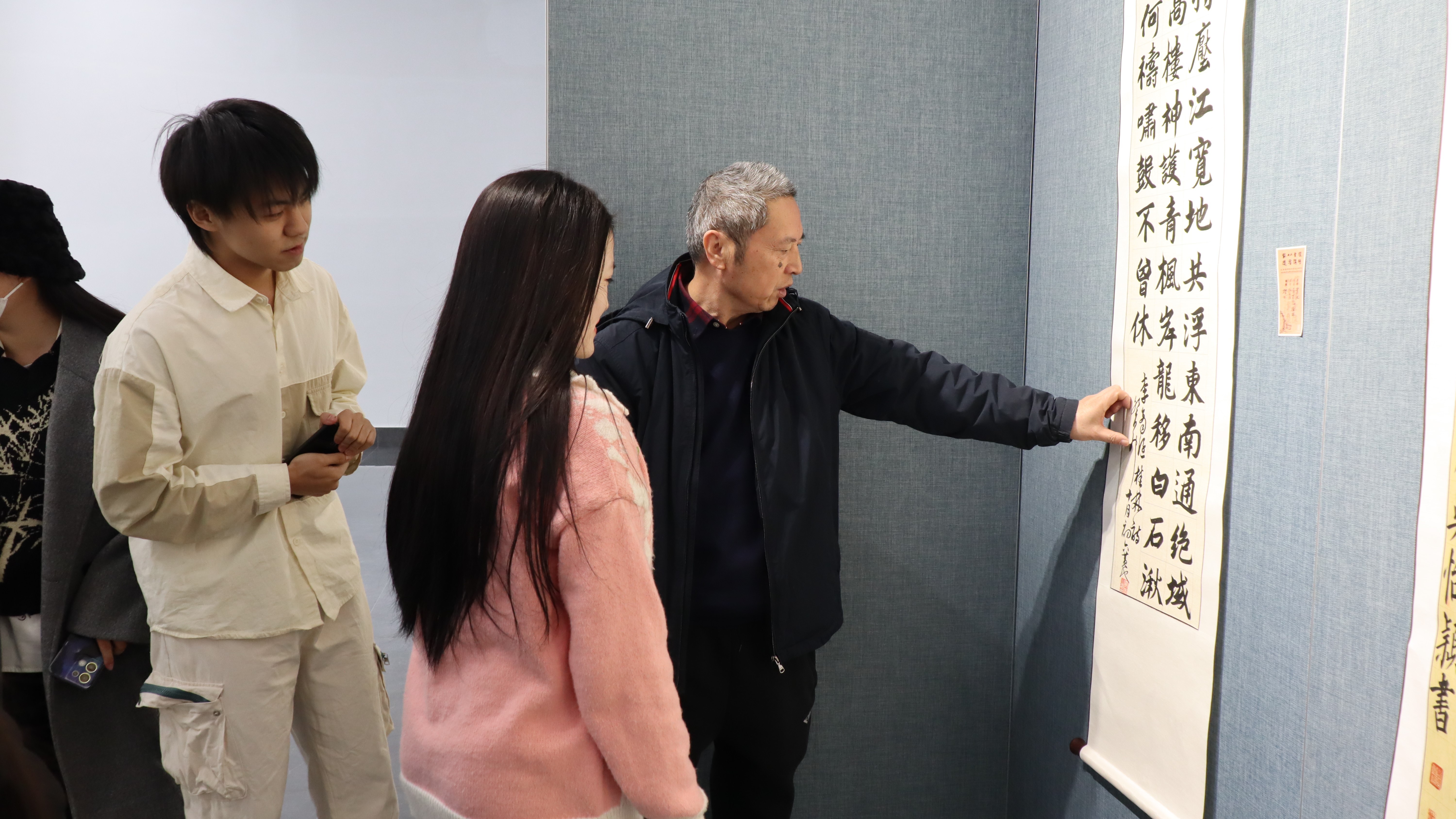 本次展览展出师生作品130幅,同时,为鼓励学生创作积极性,经美术学院书法学教授综合审评,选出一等奖2名、二等奖4名、三等奖6名、优秀奖15名。在恭祝“探赜索隐·以书载道”美术学院2022级书法学专业采风实践作品展顺利开幕的同时,期待书法学专业的同学们在以后的学习创作中取得更丰硕的成果。(张天赋 摄)