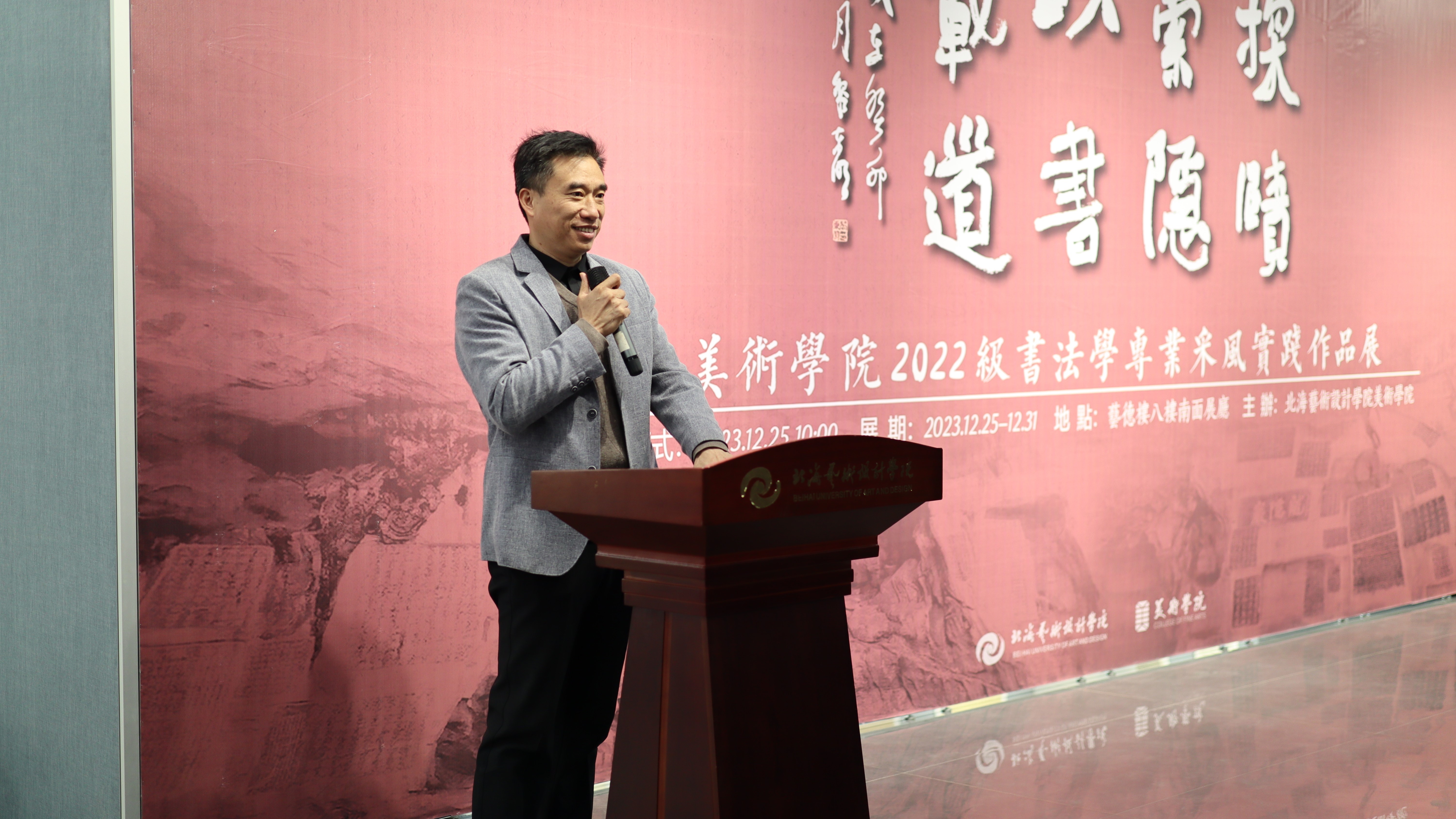 2023年12月25日上午,“探赜索隐·以书载道”美术学院2022级书法学专业采风实践作品展于北海艺术设计学院艺德楼8楼南展厅举行开幕式。北海艺术设计学院副校长陶立阳、美术学院院长龚为、美术学院书法学专业学科带头人黎东明教授、王见教授、万应均教授、邓建华教授,美术学院书法学教研室主任苏乃从以及书法学专业任课教师出席。