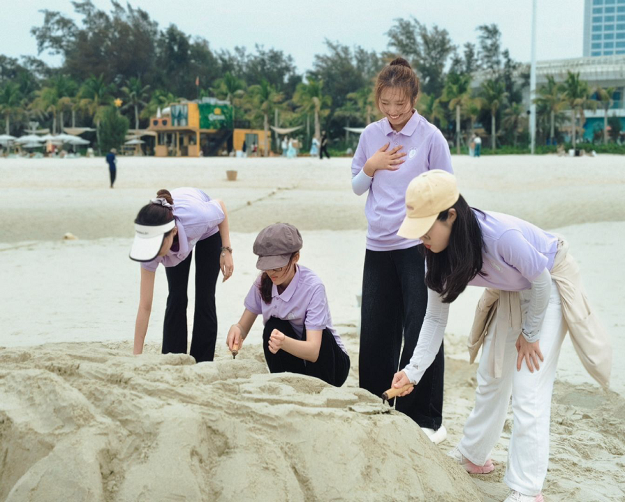 舞蹈学院的老师和同学手持工具,专注且细致地雕琢每一处细节,将丰富细腻的情感与别具一格的创意深度融入沙堆。