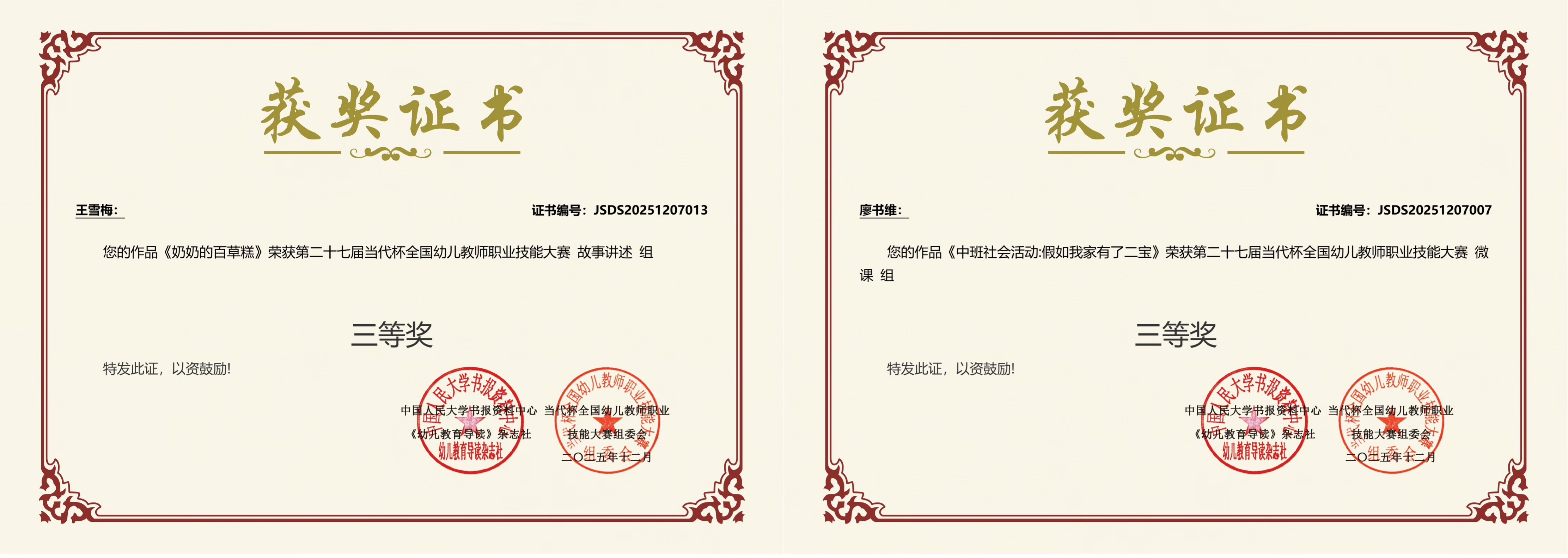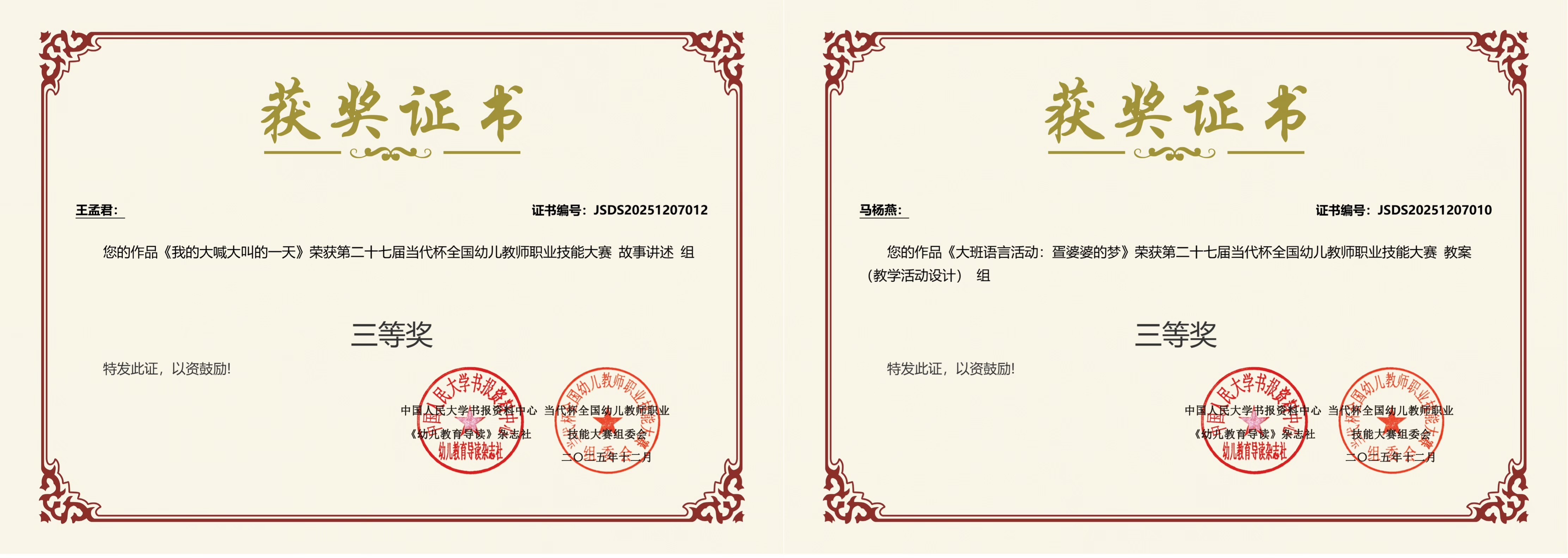 第二十七届“当代杯”全国幼儿教师职业技能大赛获奖证书