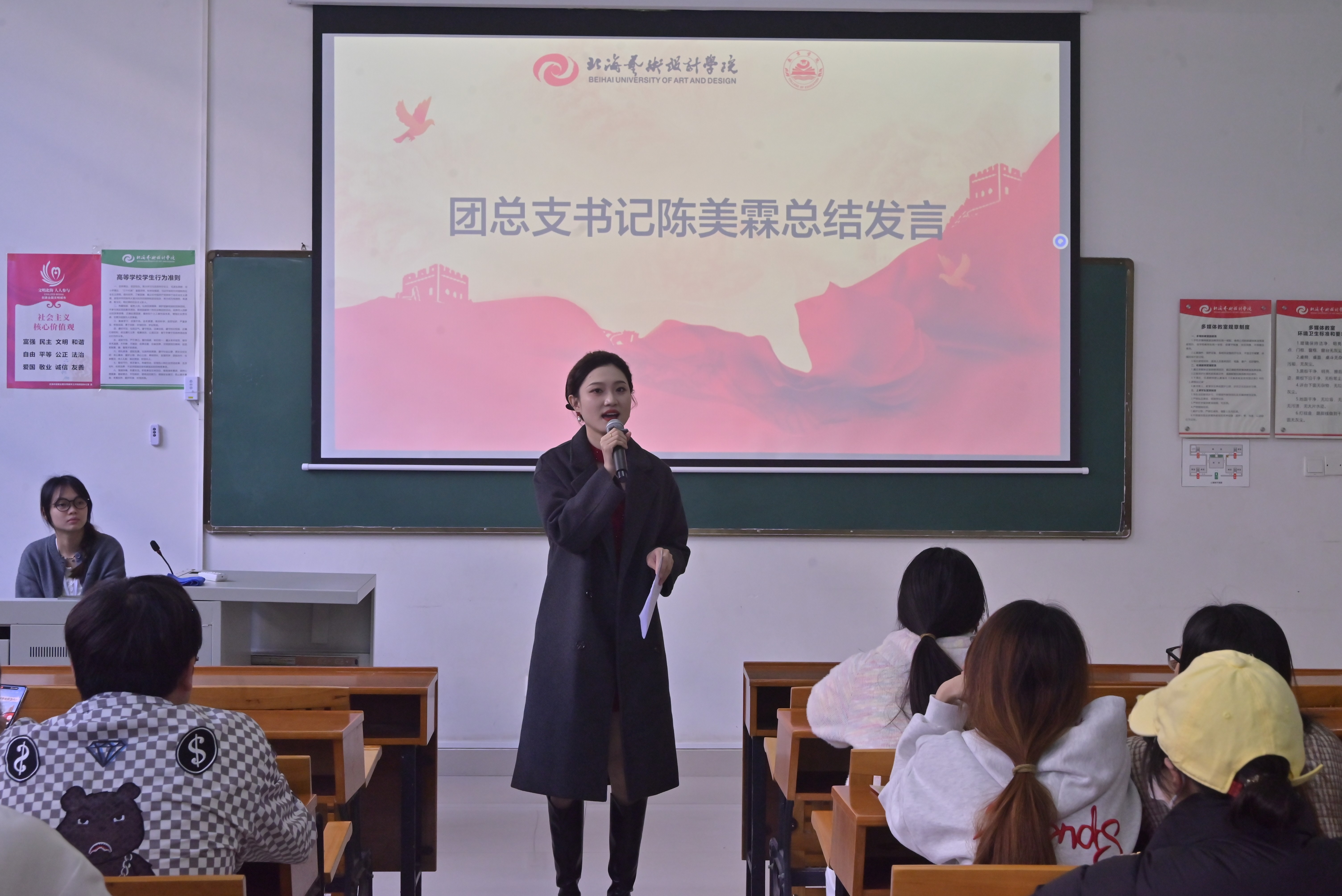 紧接着,团总支书记陈美霖作总结发言。她充分肯定了全体学生干部本学期的辛勤付出与工作实绩,同时结合学院发展与团总支工作实际,对团员干部提出新要求,希望全体团学干部不忘初心、砥砺前行,以更饱满的热情投入到新学期的工作中。
