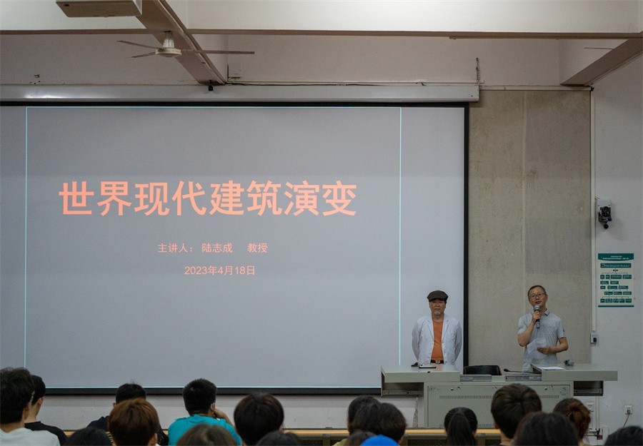 4月18日晚,于我校西校区伦理楼107教室,建筑与环境艺术学院名誉院长陆志成教授为广大师生带来了一场题为《世界现代建筑演变》的精彩讲座,讲座由王斌副校长主持。