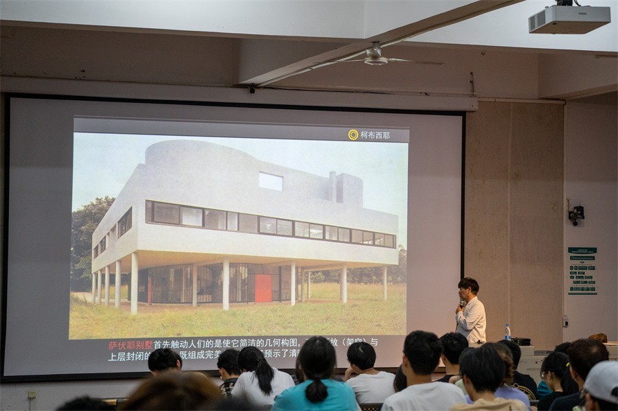 陆志成教授以时间线为线索,带领在场师生走入建筑革命的前夜——欧洲启蒙运动与工业革命,欧洲启蒙运动是现代建筑思想源头,建筑史经历了一个从古典主义到科学理性主义的演变。陆志成教授通过展示一系列建筑图片,讲述了现代建筑技术源头——第一次工业革命,进一步阐释现代主义的设计理念与语言的形成以及现代建筑的相关流派。陆教授精炼简洁的讲授让现场师生直观而深刻地感受到了现代建筑的一系列演变。