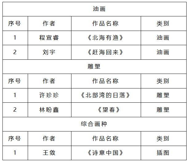 近日,全国第十四届美展评结果公布,作为五年一次的全国性重要展览,美术学院师生积极参加本次比赛斩获佳绩。程宣睿刘宇、许诊诊、林盼鑫、王敛共五名教师作品通过第十四届全国美术作品展览油画雕塑、综合画种展区评。