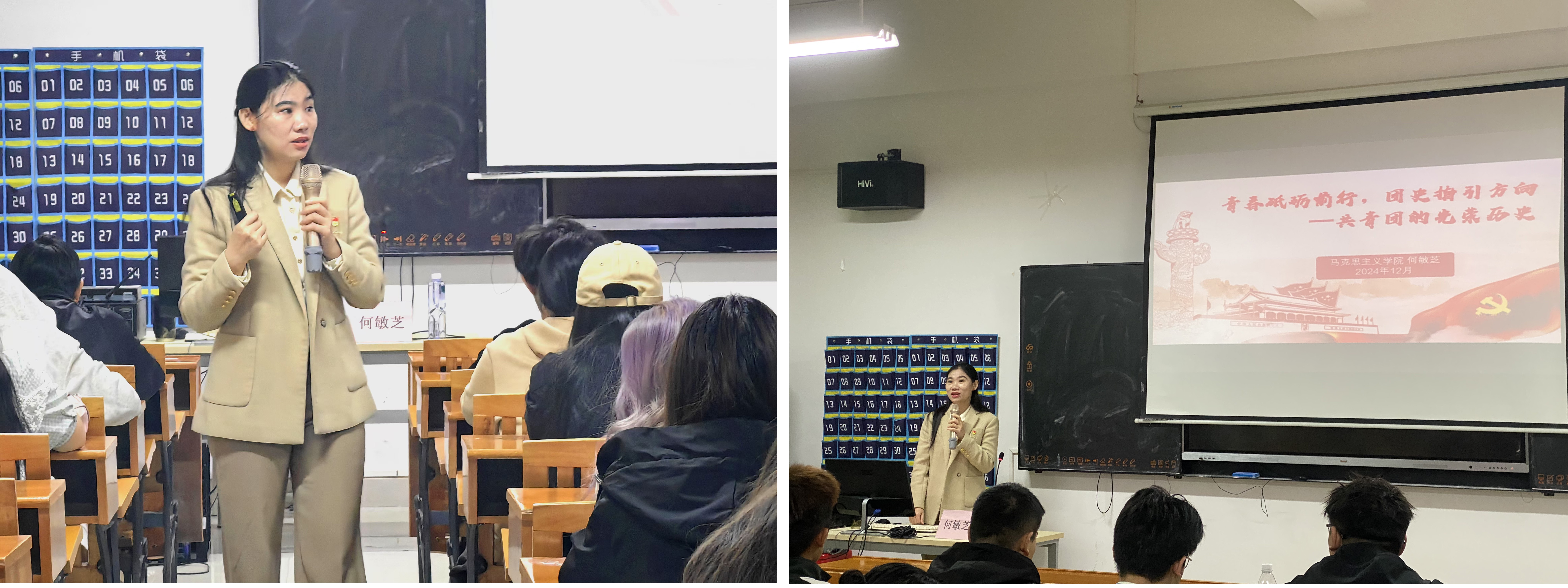 随后,何敏芝老师强调马克思主义思想是我们立党立国、兴党兴国的根本指导思想,详细讲述了中国共青团的发展历程,并对青年大学生们在日后的实践工作中做出指导,为同学们学习及工作实践指明了奋斗方向,鼓励同学们开阔思维、大胆创新。