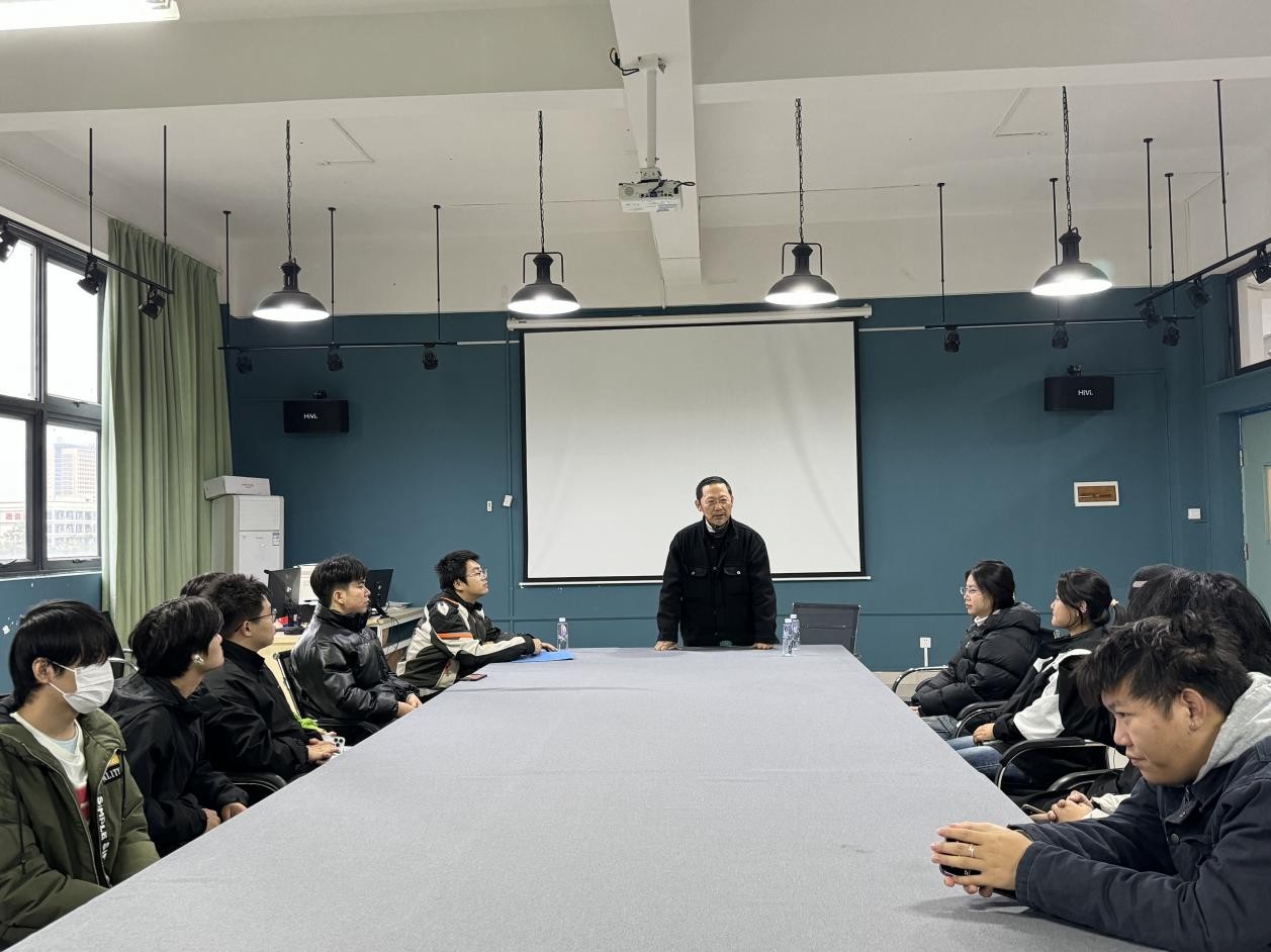 汇展结束后,刘斌院长在艺术楼313会议室跟同学们分享壁画创作经验。他提出壁画创作一定要融入到空间中去,有时空的贯通感,使得整个壁画画面突破单纯的架上绘画画面的限制,最后壁画的署名一定要和画面有结合感。