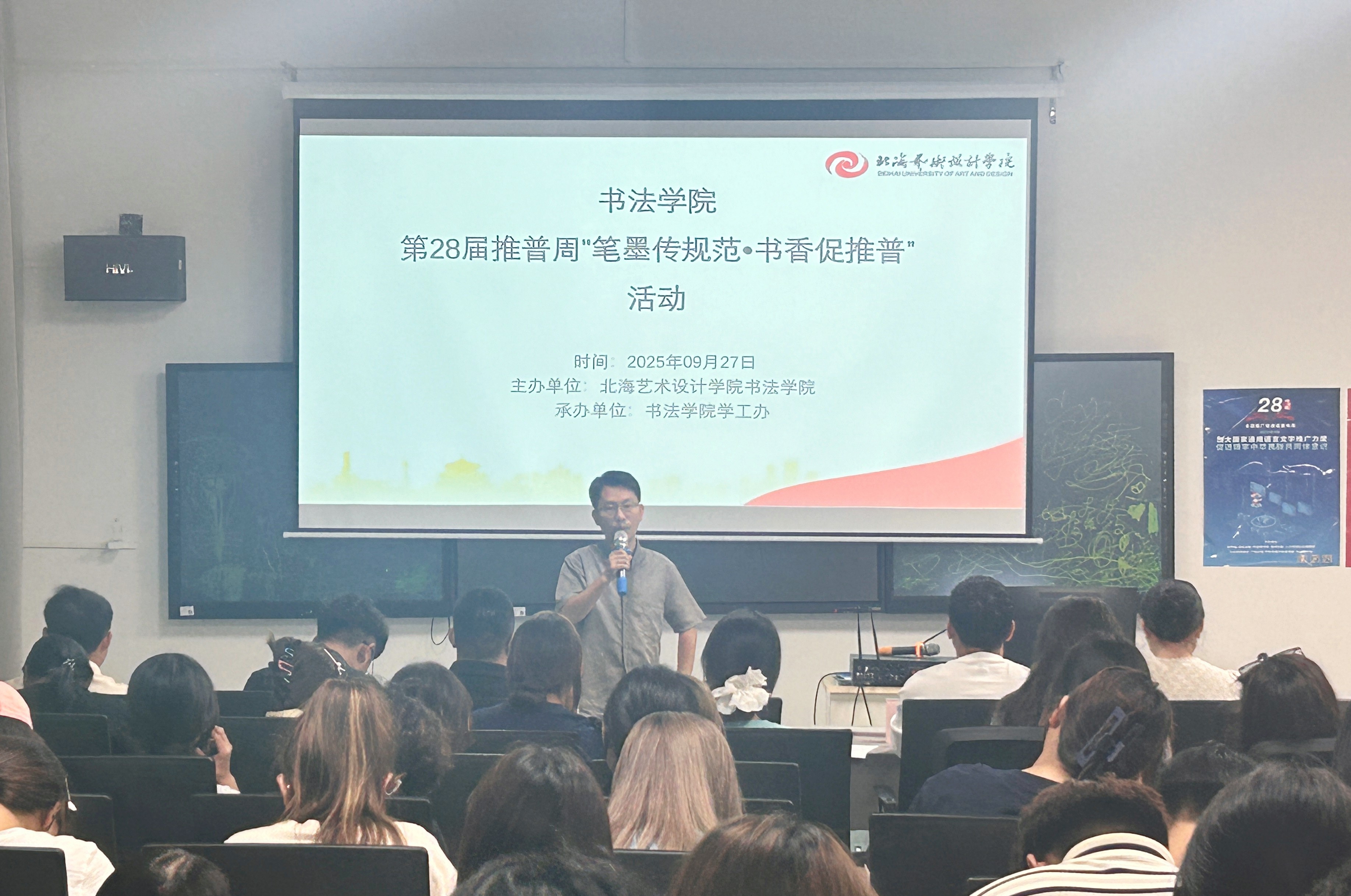 为加大国家通用语言文字推广力度,促进铸牢中华民族共同体意识,书法学院于9月19日至26日组织开展推普活动,并于9月27日在南校区艺德楼507书法教研室举办“笔墨传规范·书香促推普”宿舍规范汉字书写比赛暨推普成果展示活动。学院常务副院长苏乃从、党支部副书记左云飞,以及副院长李东垚、李家琪、黄荣婷、韦志忍共同出席并担任评审。