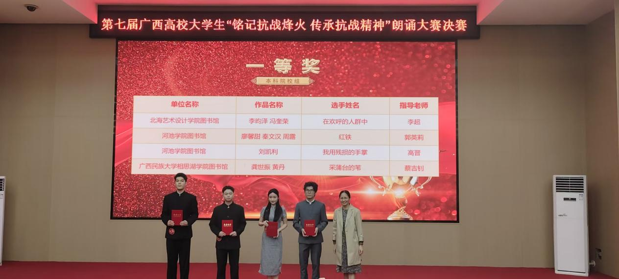 本次大赛以“铭记抗战烽火,传承抗战精神”为主题,作为广西高校语言艺术领域极具影响力的赛事,赛事自启动以来便得到全区各高校积极响应,历经校内初评、自治区复赛的层层严苛筛选,最终仅有24组选手从数百部作品中脱颖而出晋级决赛,高水平角逐的激烈程度不言而喻。传媒艺术学院高度重视此次赛事,选送作品《在欢呼的人群中》精准锚定“胜利喜悦与先烈缅怀”的情感基调,从语言表达的节奏轻重到舞台呈现的姿态眼神,以细节展现了对作品精神的深刻理解。决赛现场,李昀泽、冯奎荣同学凭借扎实的语言功底、默契的舞台配合,将抗战胜利后人民群众的自豪与崇敬诠释得淋漓尽致,稳健大气的台风赢得评委团高度认可和现场观众阵阵掌声。
