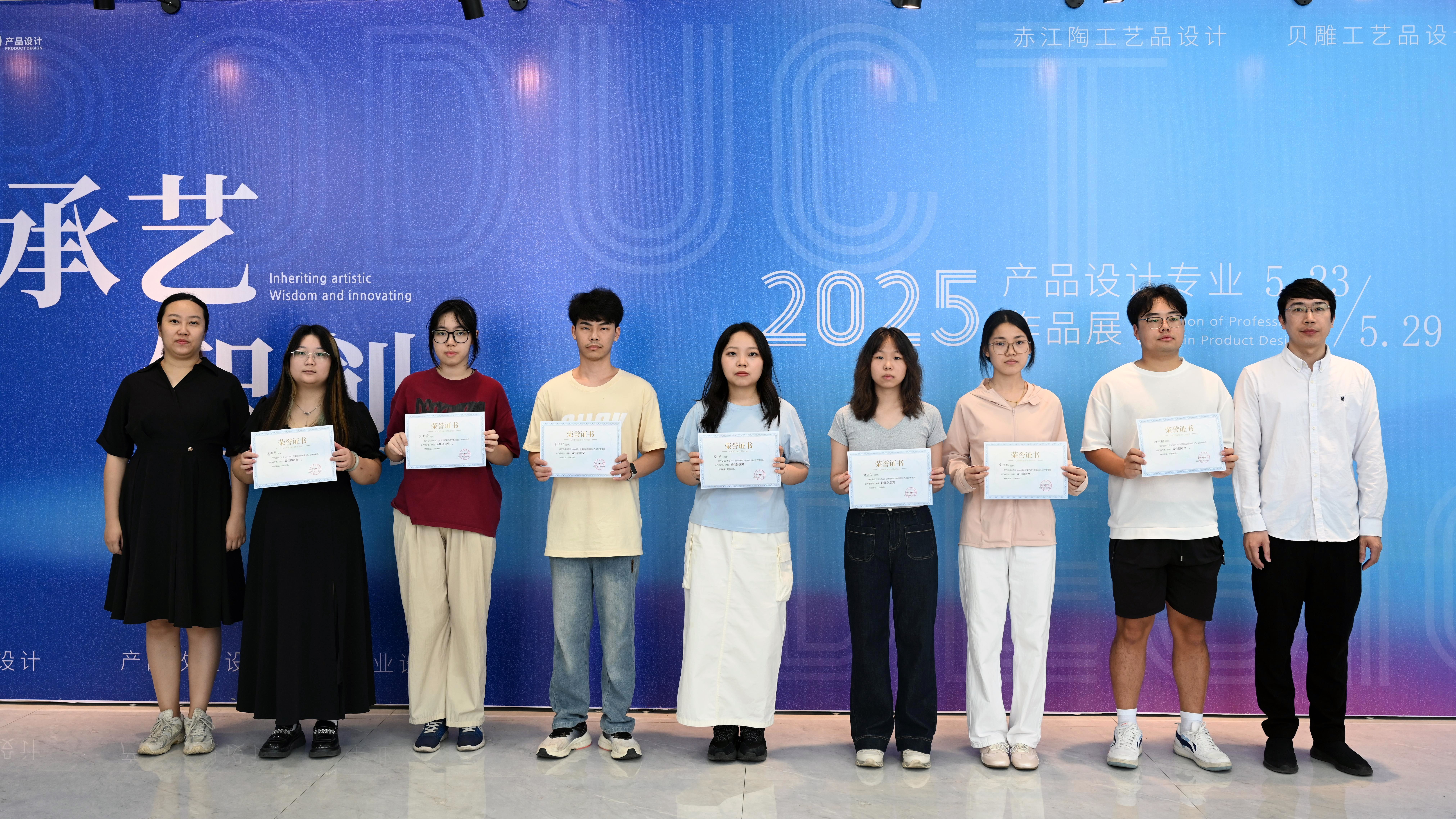 “承艺·智创”产品设计专业教学成果汇报展上,经评委会评选,12名学生斩获“最佳设计奖”,7名学生得系部LOGO设计“最佳创意奖”。出席的领导与教师为获奖学生颁发荣誉证书。