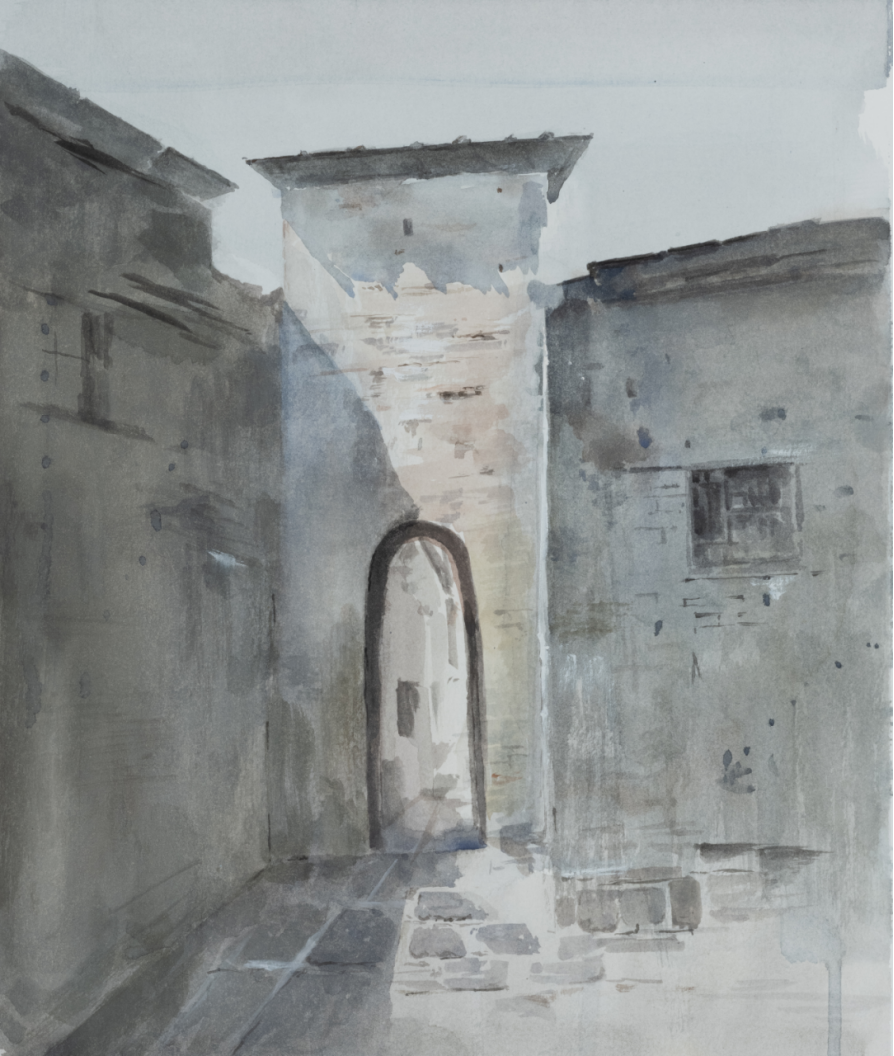 学生作品:美术学2308班,程泊乔灰墙拱下的留白》,38cmX42cm