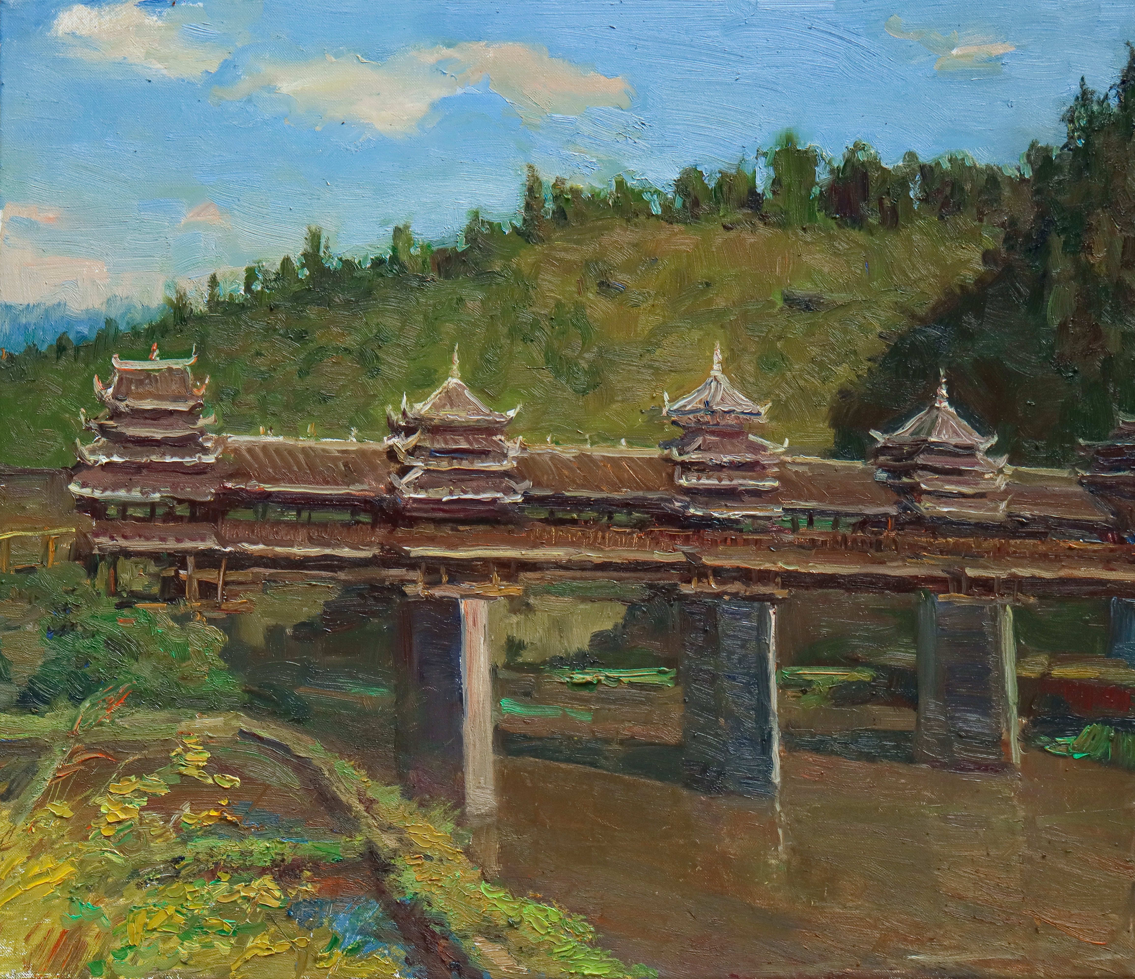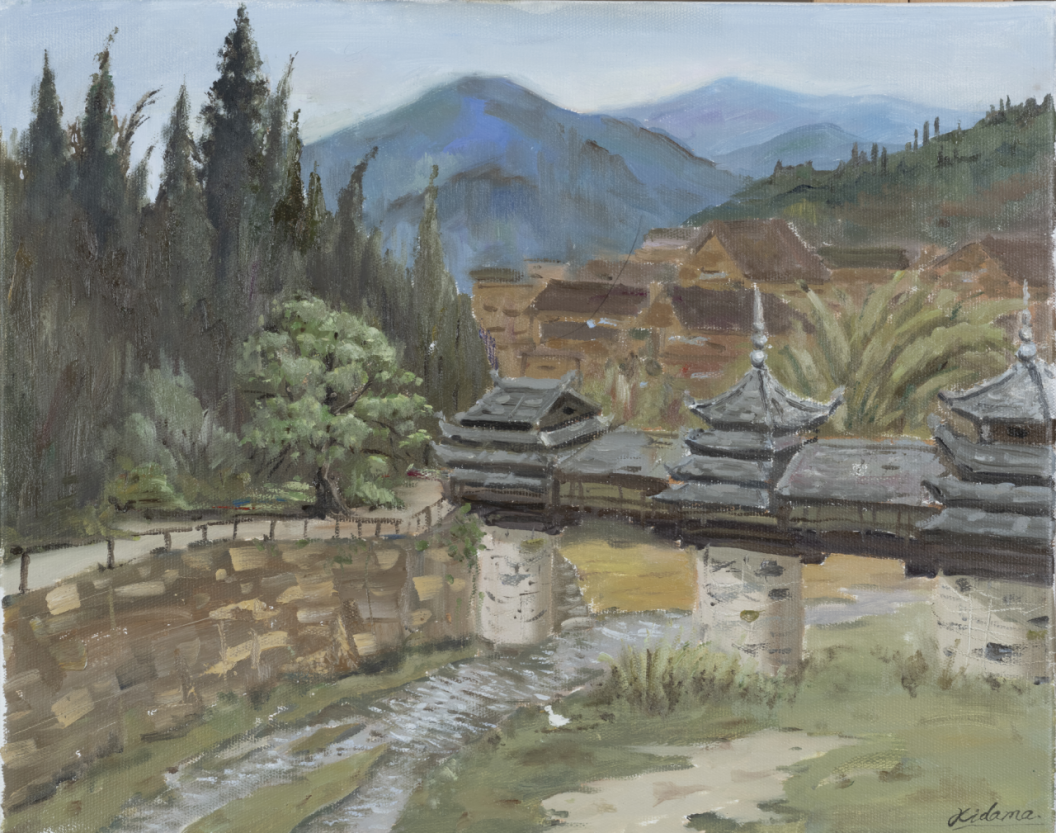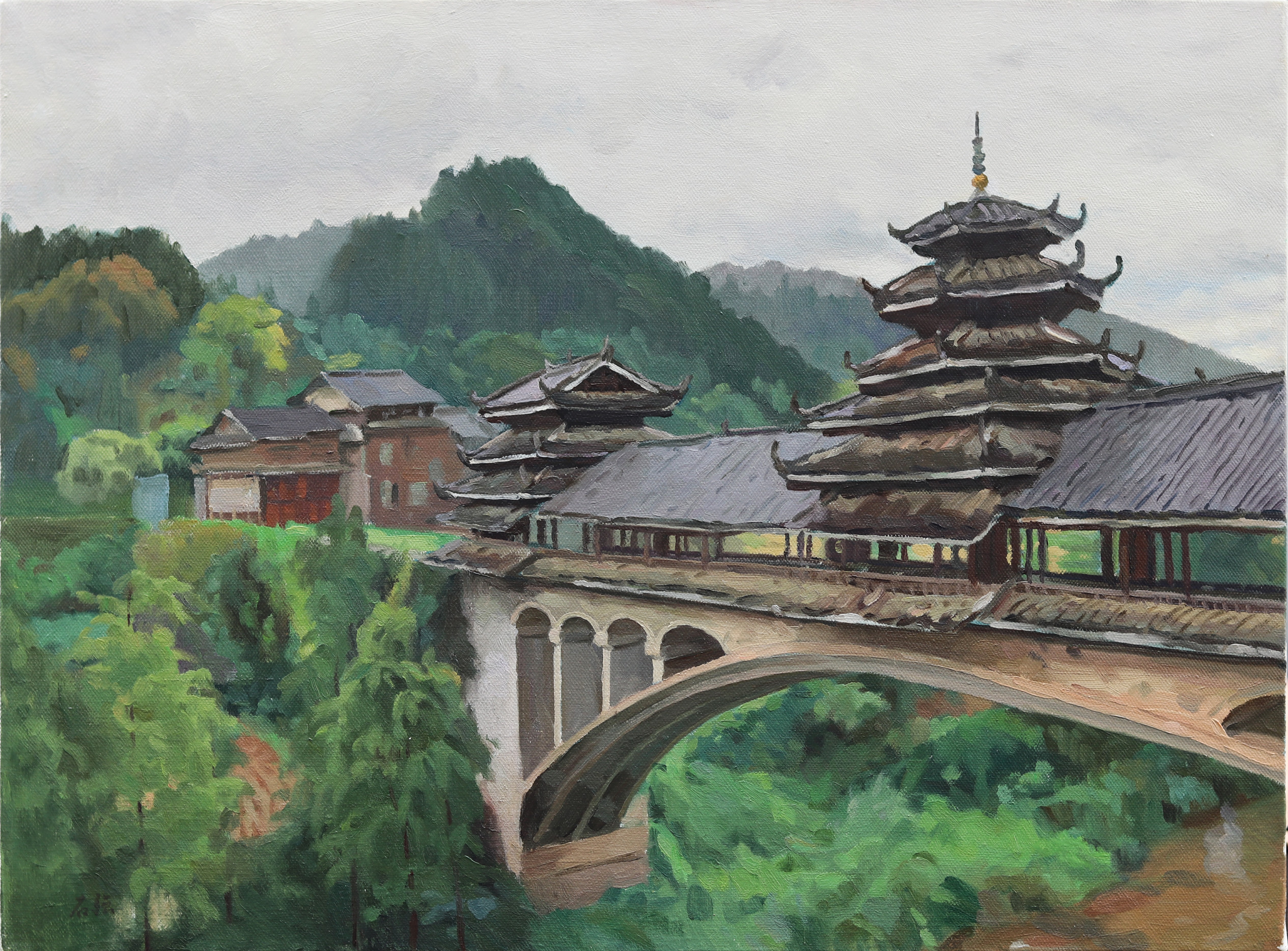 曲湘建教授作品《侗寨古桥》,80cmx60cm
