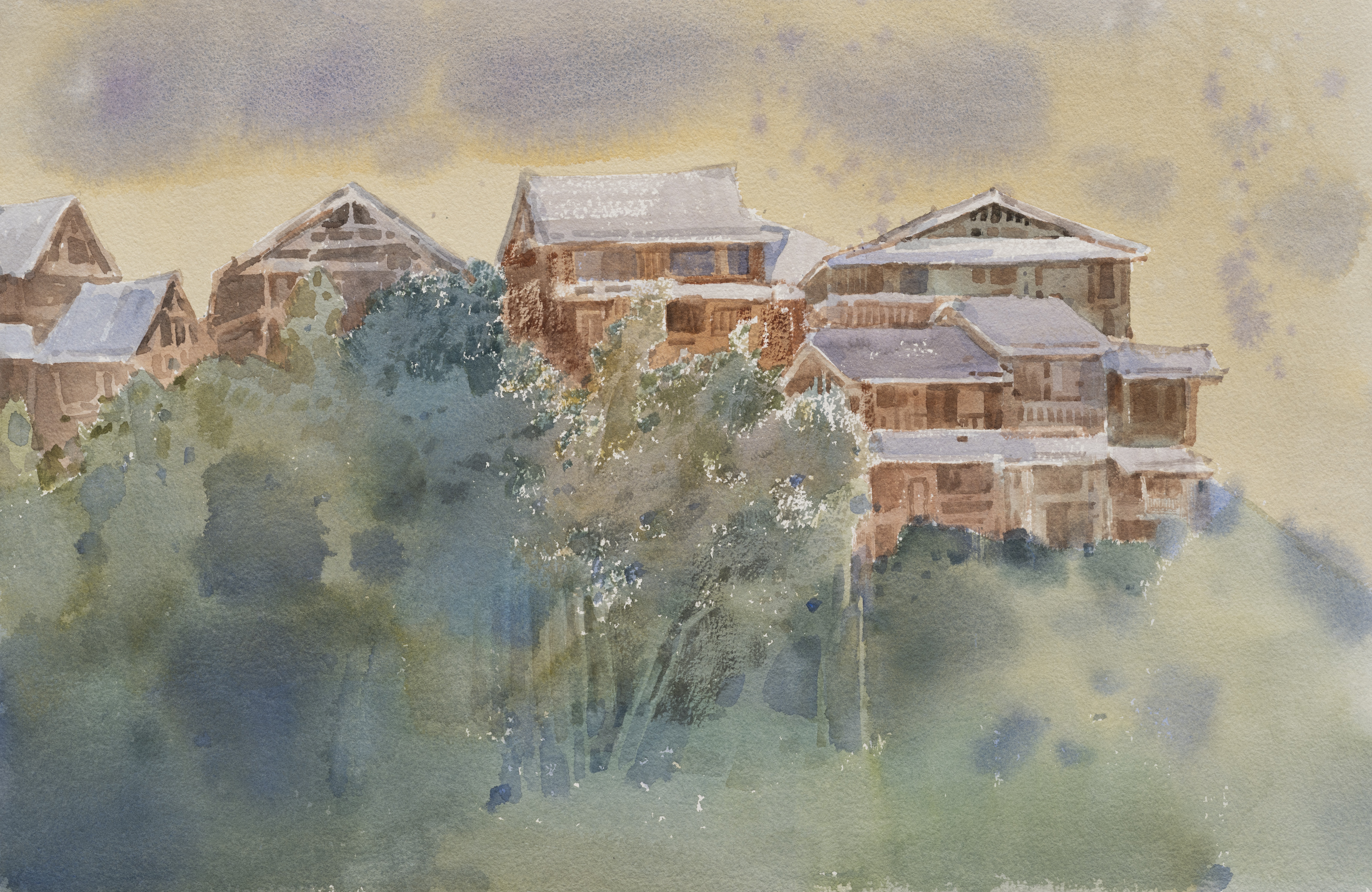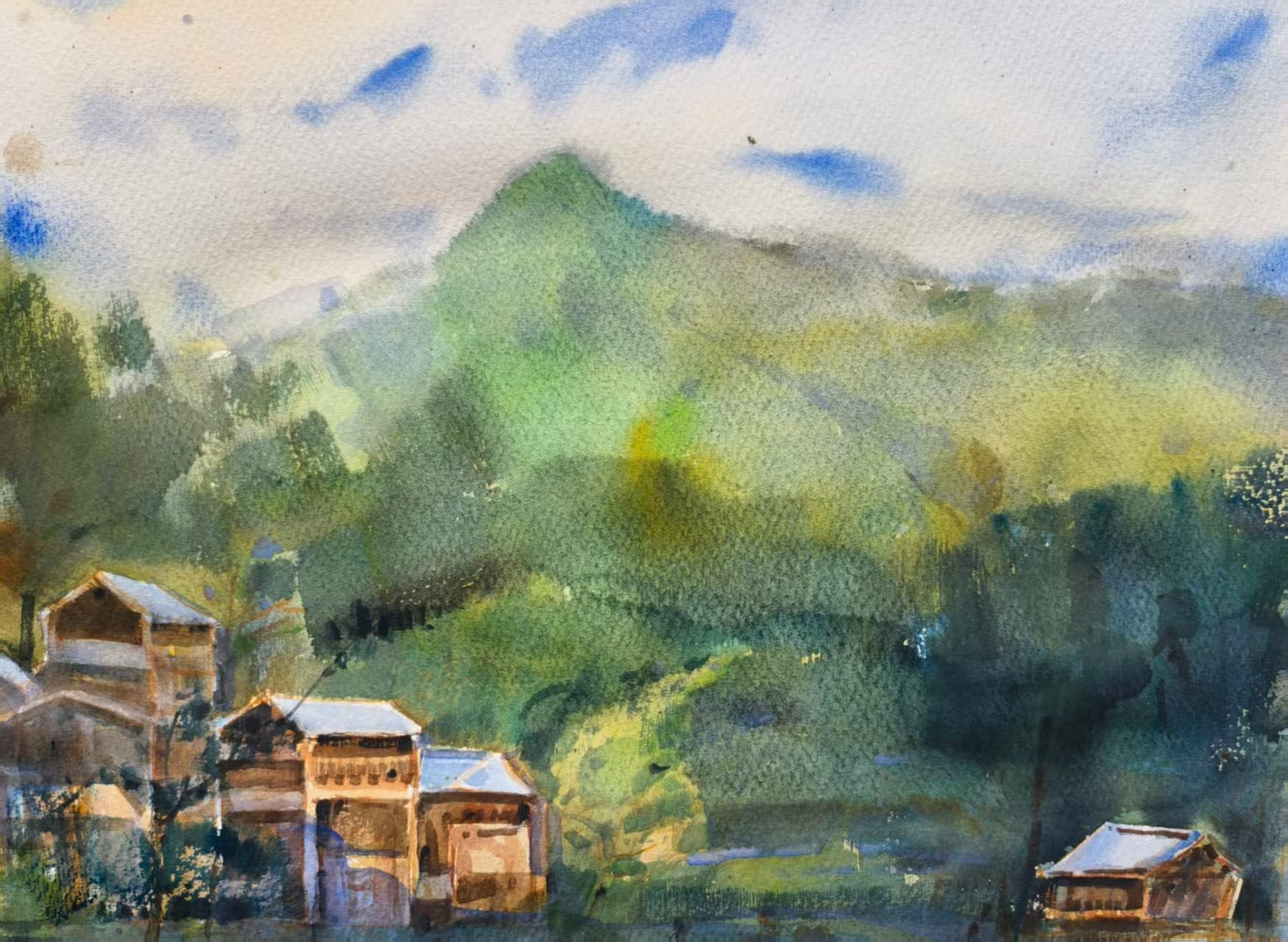 学生作品:美术学2407、08班,包敏玮水色侗居》,38cmX54cm