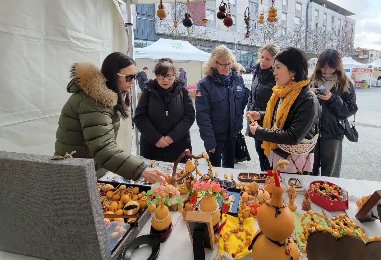 2月22日-2月23日,法国勒布朗梅尼勒市市政广场的“中国年新春市集”则成为非遗展示的焦点展区。教师团队精选各类手作产品与文创产品集中亮相,每一件作品都凝聚着东方美学与匠心巧思。现场设置“技艺体验区”,各学院教师手把手指导法国观众完成陶瓷手作、非遗簪花、书法篆刻等系列活动。许多观众亲手制作自己有趣的作品,将这份独一无二的中国年味带回家中,让经典特色文化融入日常生活。一场场生动的艺术对话,让中法观众在审美共鸣中,读懂不同文化背景下对美的共同追求,也让东方手工艺在跨文化交流中焕发新活力。此次赴法交流,不仅是传统技艺的展示,更是文化自信的传递,这正是文化交流的核心价值所在。