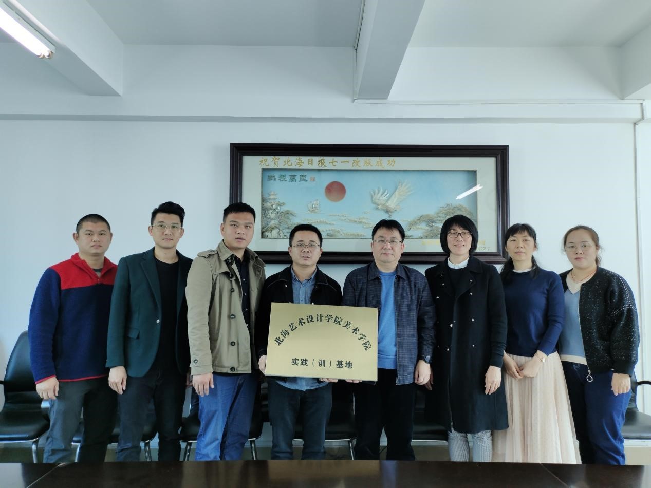 2022年1月7日上午,北海艺术设计学院第五总支部书记韩玮、龚为副院长一行赴北海日报社举行校企合作挂牌仪式。北海日报社党委副书记、总编辑李军对我院一行表示欢迎,并对报社的基本情况做了介绍,同时也对我校基本情况、专业建设、以及就业情况进行更深一步的了解,高度赞扬我校办学以来在服务地方经济建设所赢得的良好口碑,并在“思政”、“新闻拍摄”、“宣传”等题材的拍摄明确了业务标准,预祝双方在人才培养和输送上实现双赢局面。报社总编助理、融媒体采访中心主任严丹介绍了社里“融媒体”的业务岗位需求。融媒体发布中心负责人李维维针对校企对接的人才培养方向提出需求,欢迎数绘专业学生参与到“海报突击队”的实践当中。