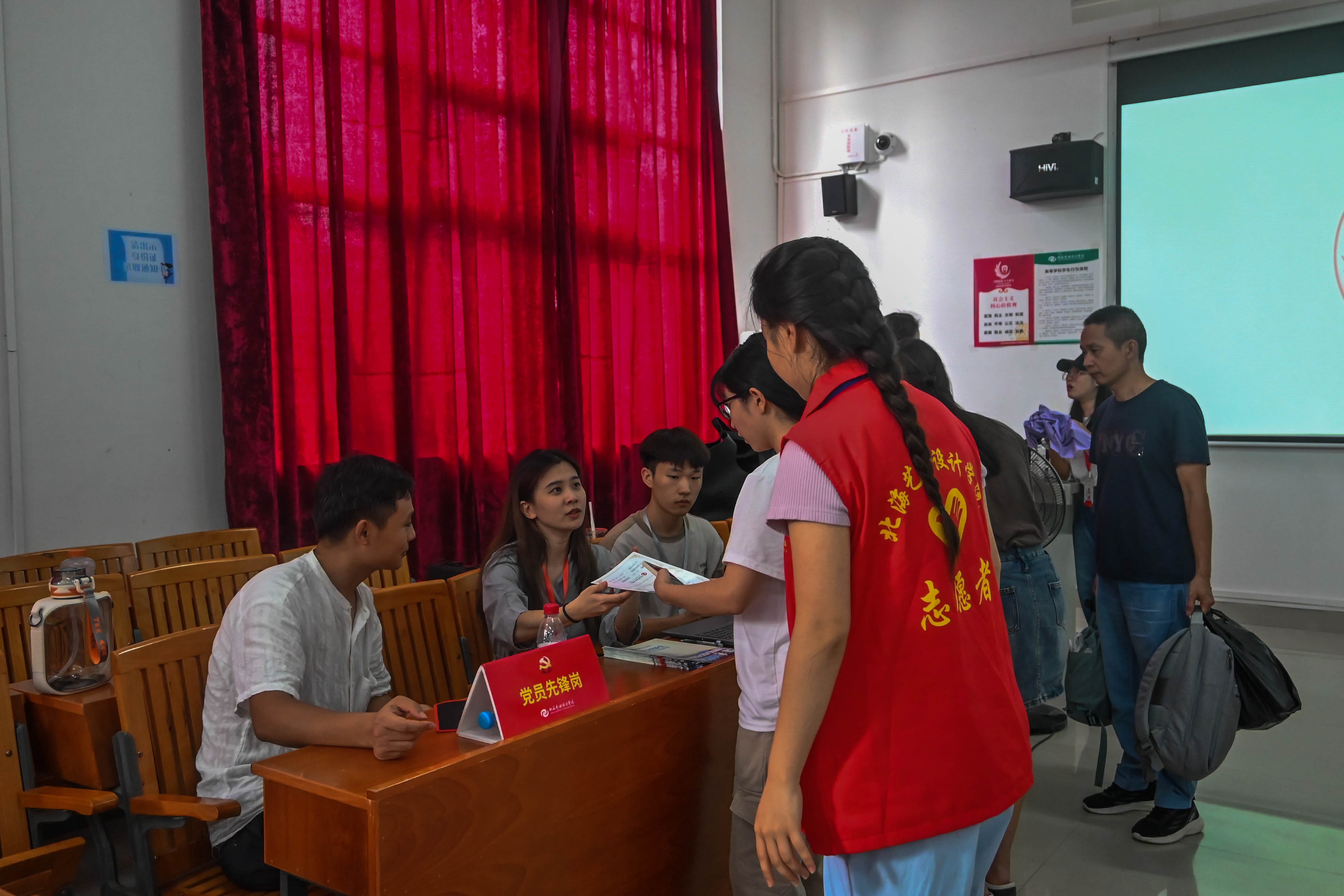 报到当天,教师党员、学生预备党员以及入党发展对象、入党积极分子新生接待志愿者早早到达迎新场地。在火车站迎新接待点,志愿者在出站口高举接站牌翘首以盼,接到新生后便热情地引导他们到乘车点乘车,过程中主动帮新生学搬运行李,提醒大家注意安全。在校内迎新接待点,志愿者引导新生按照报到流程办理入学手续,帮助新生搬运行李,志愿者为新生介绍校园环境。为了方便新生及家长快速辨识,志愿者统一穿着红色志愿服,佩戴工作牌。纵使身心疲惫、大汗淋漓,志愿者仍精神饱满,认真做好迎新工作。