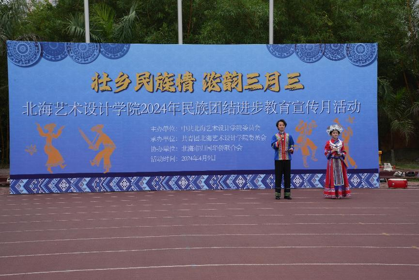 4月9日,学校党委联合学校团委、北海市归国华侨联合会在西区操场开展以“壮乡民族情 ,浓韵三月三”为主题2024年民族团结进步教育宣传月活动。
