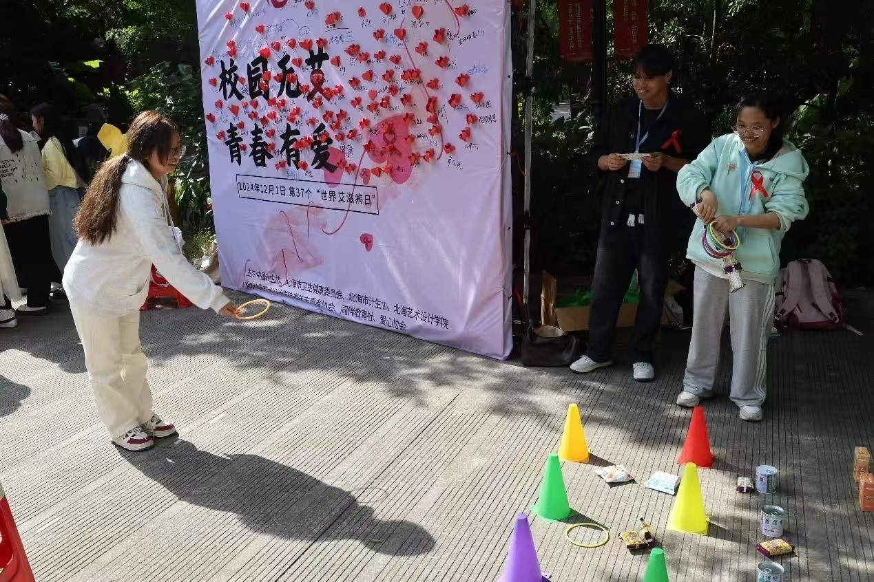 在伦理楼前,通过“艾”的抱抱、“艾”变成“爱”、“艾”的预防,“爱”的传播、“艾”的圈套等多个互动小游戏,号召更多同学加入知“爱”防“艾”的行动中来,表达了爱的传递与流动,呼吁在这个充满“爱”的校园里,提升预防“艾”的能力。在游戏结束后,部分同学还积极分享了自己对于艾滋病的认识与看法,在校园内营造了一种积极向上、充满爱的氛围,呼吁同学们用实际行动传递“爱”。