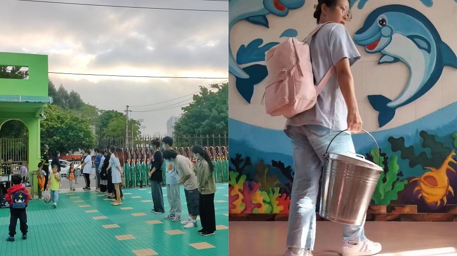 见习生迎接小朋友入园 见习生协助保育老师拿早餐