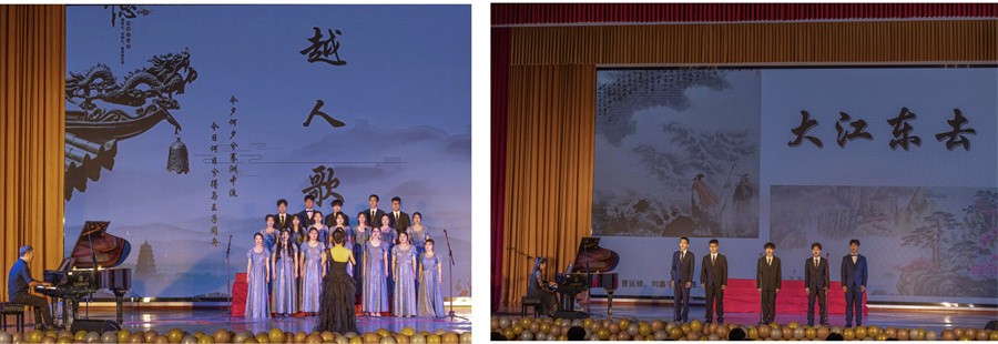一首意境优美、荡人心绪的《越人歌》,拉开了演出的序幕。《大江东去》男生合唱,曲调淳朴、气息宽广,格调舒展、气韵潇洒。