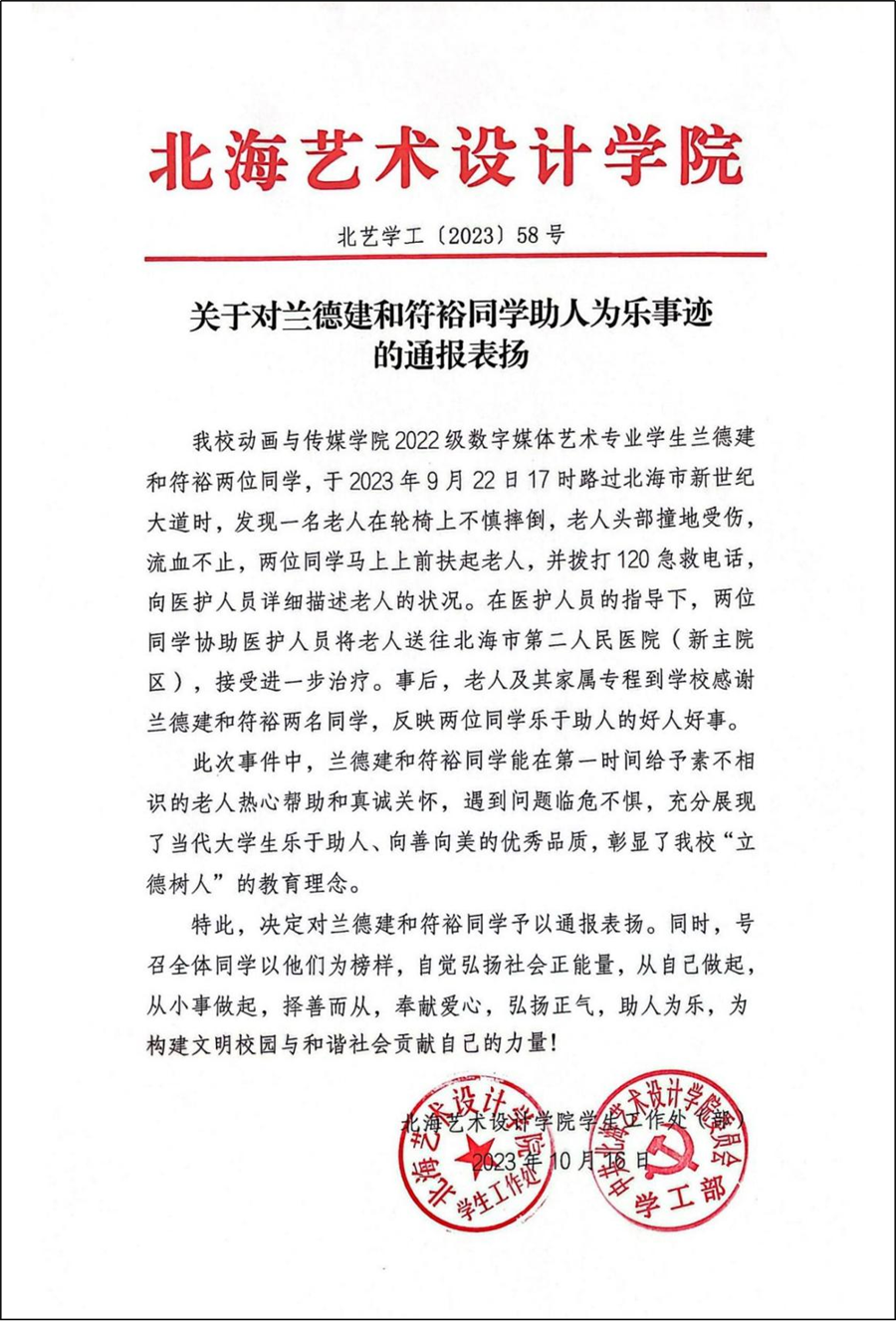 针对此次事件,动画与传媒学院党总支副书记黄强红表示,兰德建和符裕面对老人摔倒‘扶不扶’的问题,两位同学能在关键时刻挺身而出,毫不犹豫伸出援手,第一时间给予素不相识的老人热心帮助和真诚关怀,遇到问题临危不惧,所展现出的乐于助人、向善向美的优秀品质,表明学校强化青年思想政治引领,落实立德树人根本任务,将立德树人融入到思想道德教育、文化知识教育、社会实践教育各个环节的效果明显。