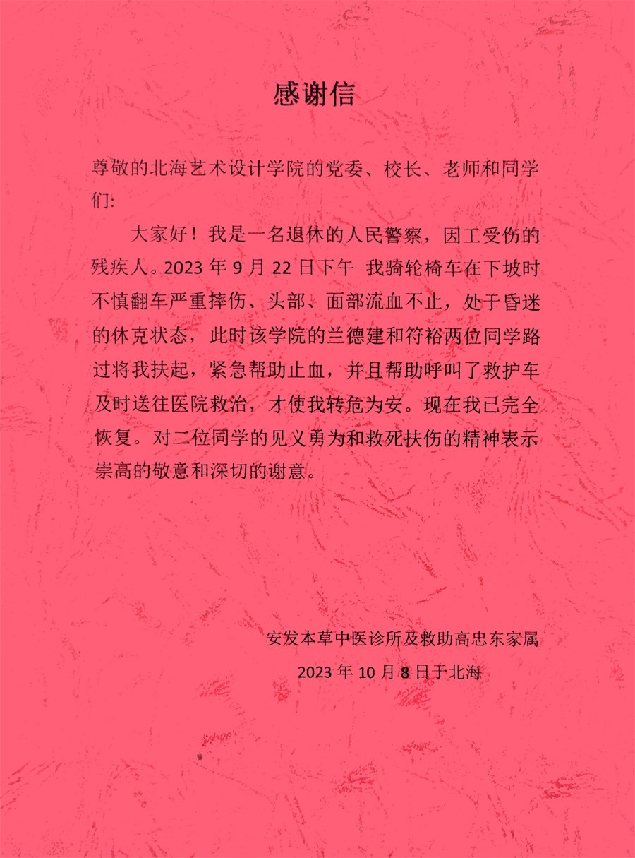 10月9日,一位坐着轮椅的老人及其家属来到我校动画与传媒学院,将一封感谢信递到我校2022级数字媒体艺术专业学生兰德建和符裕两位同学手中,一场“暖心施救显担当,苦寻学生道感谢”的爱心善举就此被众人知晓,而高忠东老人在惦念了17天后,心中一块大石头也终于落地。