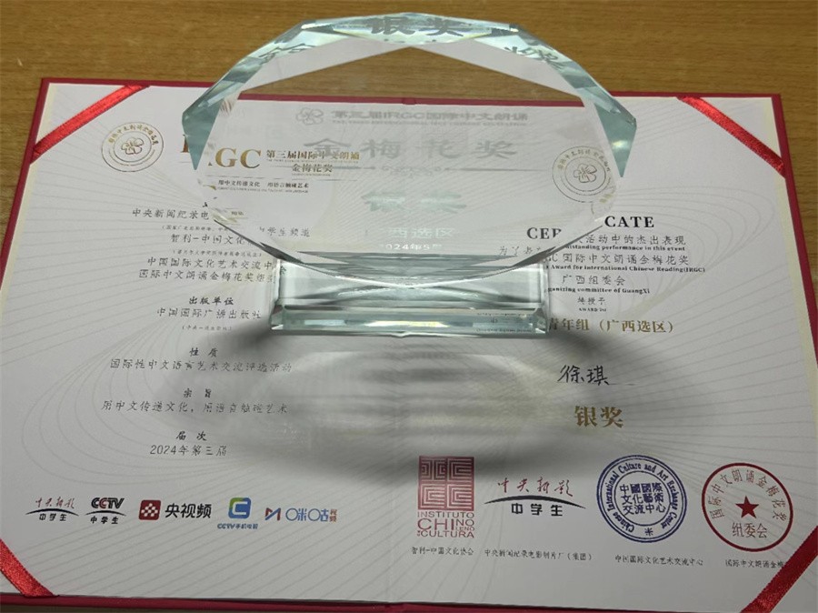 5月26日,第三届IRGC国际中文朗诵金梅花奖广西选区选拔活动圆满闭幕。我校动画与传媒学院2022级播音与主持艺术专业学生徐琪凭借其出色的发挥和卓越的表现斩获青年组银奖的佳绩。