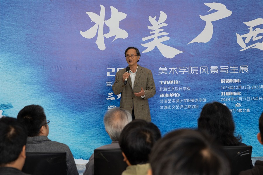 12月31日下午,由北海艺术设计学院主办,美术学院与北海市文艺评论家协会共同承办的“壮美广西·三地风情——美术学院2024风景写生展”在学校展厅9楼(北)开幕。原中央美术学院党委副书记、北海艺术设计学院特聘教授、展览学术主持王少军,北海艺术设计学院特聘教授、艺术家、收藏家何二民,北海艺术设计学院特聘教授、一级美术师、美术学院肖畅恒,北海艺术设计学院特聘教授、北海市画院院长、北海市美术家协会主席蔡群徽,北海艺术设计学院特聘教授、雕塑家刘峰,北海市收藏研究会会长游刘清东等艺术界知名人士,我校党委书记覃宪儒,校长卢新华,常务副校长胡胜,副校长陶立阳、包建明,动画与传媒学院院长孙永辉,美术学院党总支书记韩玮,执行院长龚为,副书记鲁明阳,副院长金凯婧、肖玺、殷声出席开幕式,美术学专业带头人唐海等学院领导、教授以及美术学院各教研室主任、副主任、专业教师参加开幕式。开幕式由美术学教研室教师李洋帆主持。