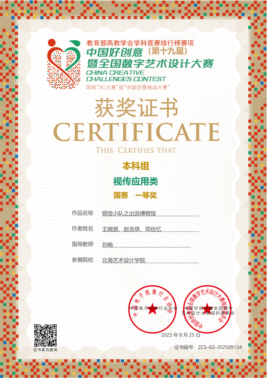 据悉,中国好创意暨全国数字艺术设计大赛(“China creative challenges contest”,简称“3c大赛”或者“中国创意挑战大赛”),是入选教育部中国高等教育学会发布的《全国普通高校大学生竞赛分析报告》赛项,是我国第一个以数字艺术、数字设计、数字创意、数字媒体以及数字技术创新领域各专业综合类规模大、跨学科、多专业、参与院校多、影响广泛的权威赛事,也是我国第一个将比赛上升到哲学高度的赛事。该大赛是第一个免费为参赛作品提供版权保护与存证的大赛,为全国数字艺术、设计、媒体等领域的师生提供了一个展示才华、交流理念、实践创新的高水平平台。