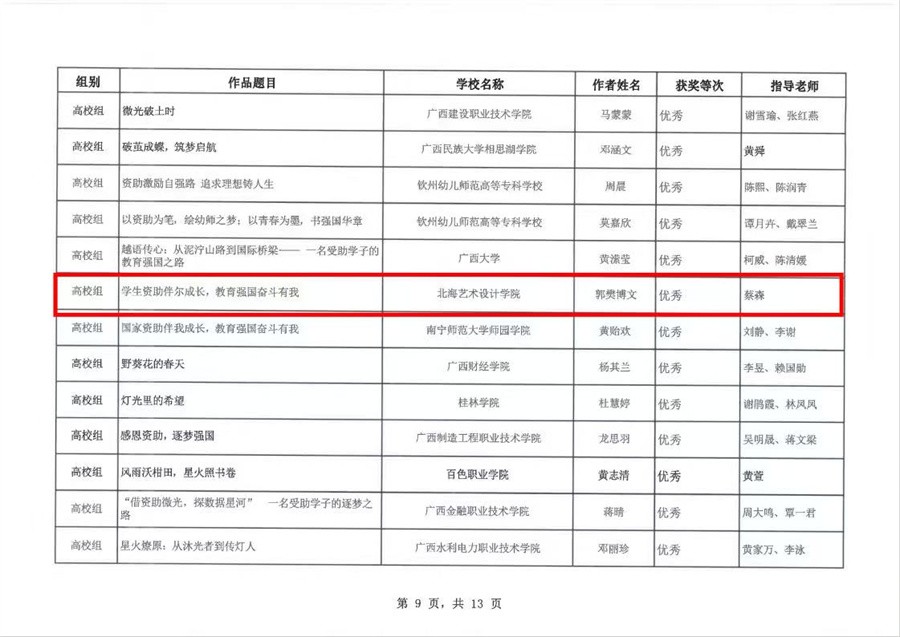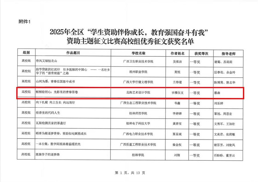 为进一步加大学生资助政策宣传力度,全面展示资助政策落实成效,切实推动国家学生资助政策家喻户晓、深入人心,自治区教育厅组织2025年全区“学生资助伴你成长,教育强国奋斗有我”资助主题征文比赛。我校2名学子在此次征文比赛中喜获佳绩,其中作品《帧帧绘初心:光影里的青春答卷》获一等奖,《学生资助伴尔成长,教育强国奋斗有我》获优秀奖。