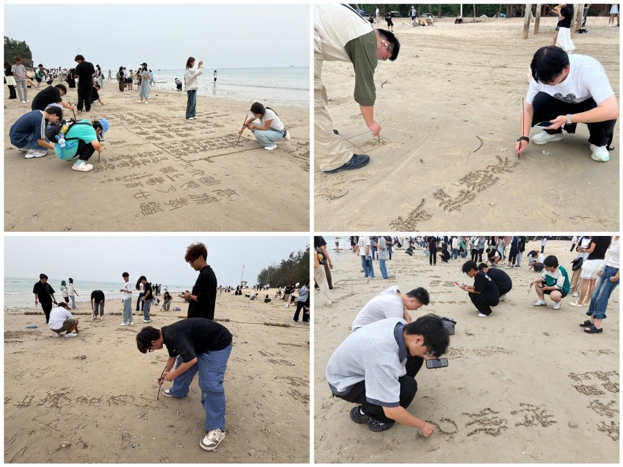 11月17日,书法学院首届“沙韵书香・笔耕蓝海”沙滩书法大赛在涠洲岛贝壳沙滩启幕。书法学院常务副院长苏乃从详细介绍了赛事规则与安全须知,强调在自然环境中创作既要展现艺术创造力,也要牢固树立安全意识与环保理念。随后,师生共同转入实践创作环节,依托海滩独特的自然场景,展开现场书写。在教师的引导下,学生通过“以手代笔、以沙为纸”的方式,亲身体验“锥画沙”笔法的独特韵味,在潮汐边界感受笔锋与沙粒的摩擦,有效提升了艺术感知力与创作适应性,为专业学习积累了鲜活实践经验。