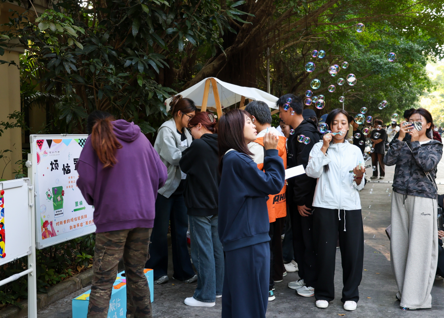 “烦恼置换”完毕,活动现场旋即升起第二重“欢乐滤镜”——吹泡泡环节。蘸满皂液的泡泡棒,迎着冬日阳光轻轻一吹,七彩泡泡成群结队跃向空中,引发阵阵欢笑声,压力像被戳破的薄膜,在清脆的“噗”声里化作光斑,一同消散在蓝天深处,大家的烦恼也随之散去。