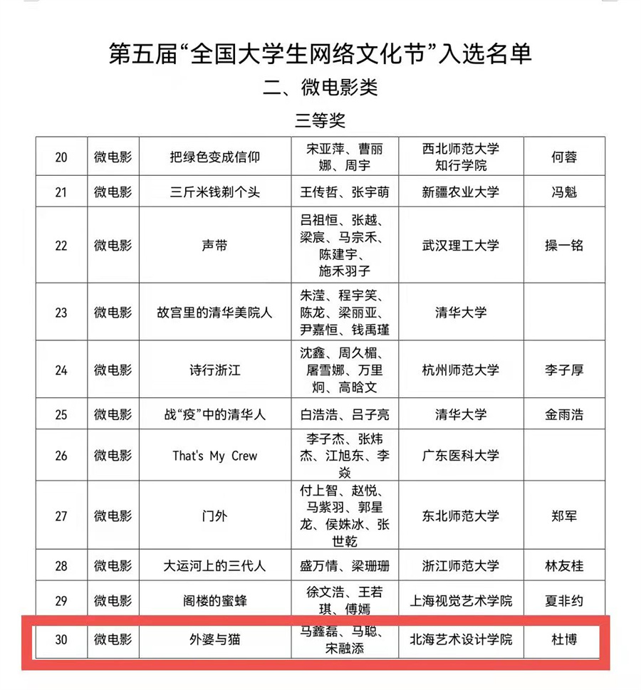 近日,教育部官网公布第五届“全国大学生网络文化节”和“全国高校网络教育优秀作品推选展示活动”评审结果,我校报送的微电影作品《外婆与猫》获得全国三等奖。