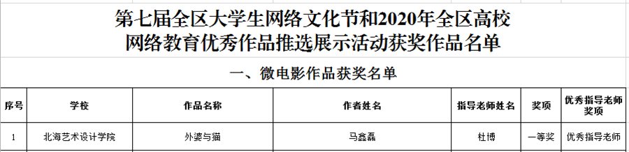 本次活动以学习“四史”践使命,传播青春正能量,争做校园好网民为主题,该活动自2020年12月开展以来,得到了各地各高校和广大师生的积极响应。两项活动共收到作品54822件,覆盖全国31个省(区、市)和新疆生产建设兵团。学校接到活动通知后高度重视,迅速安排部署各项参赛工作,积极动员师生,组织征集、筛选作品参赛,经过激烈角逐,选送作品《外婆与猫》突出重围,获得佳绩。此前,该微电影作品在第七届全区大学生网络文化节和全区高校网络教育优秀作品推选展示活动中获得微电影类一等奖,作品指导老师杜博获优秀指导老师奖项。