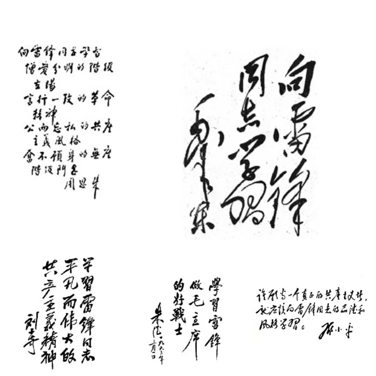 1963年3月5日,毛泽东“向雷锋同志学习”题词发表。随后,刘少奇、周恩来、朱德、邓小平等老一辈革命家也相继题词,发出学习雷锋的伟大号召。
