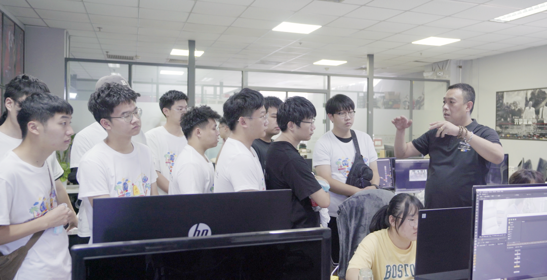 考察团一行先后对海纳文化的公司环境、人员架构、员工工作状态等进行实地考察,重点调研了公司发展现状、业务板块及人才需求等情况。在海纳三川文化传媒有限公司副总裁邢江峰的带领下,学生近距离观摩了影视项目后期制作流程,对各部门的工作运转模式有了更直观的理解和认识。