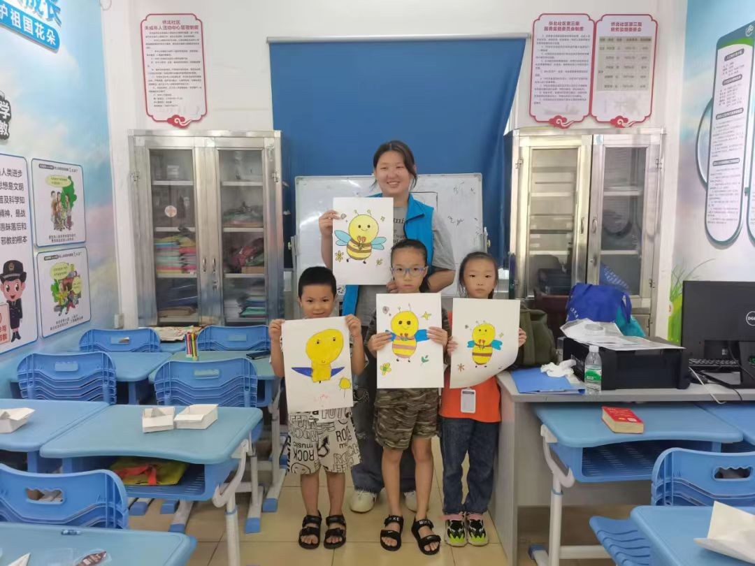 再来看看桥北社区的孩子们,等待他们的是一只小蜜蜂。志愿者们耐心地向他们教授绘画技巧,用铅笔一遍遍勾勒出蜜蜂的雏形。很快,活灵活现的小蜜蜂在小朋友们的绘笔下出现啦!通过这次活动,孩子们也明白了要像小蜜蜂一样勤劳,懂劳动,去劳动。